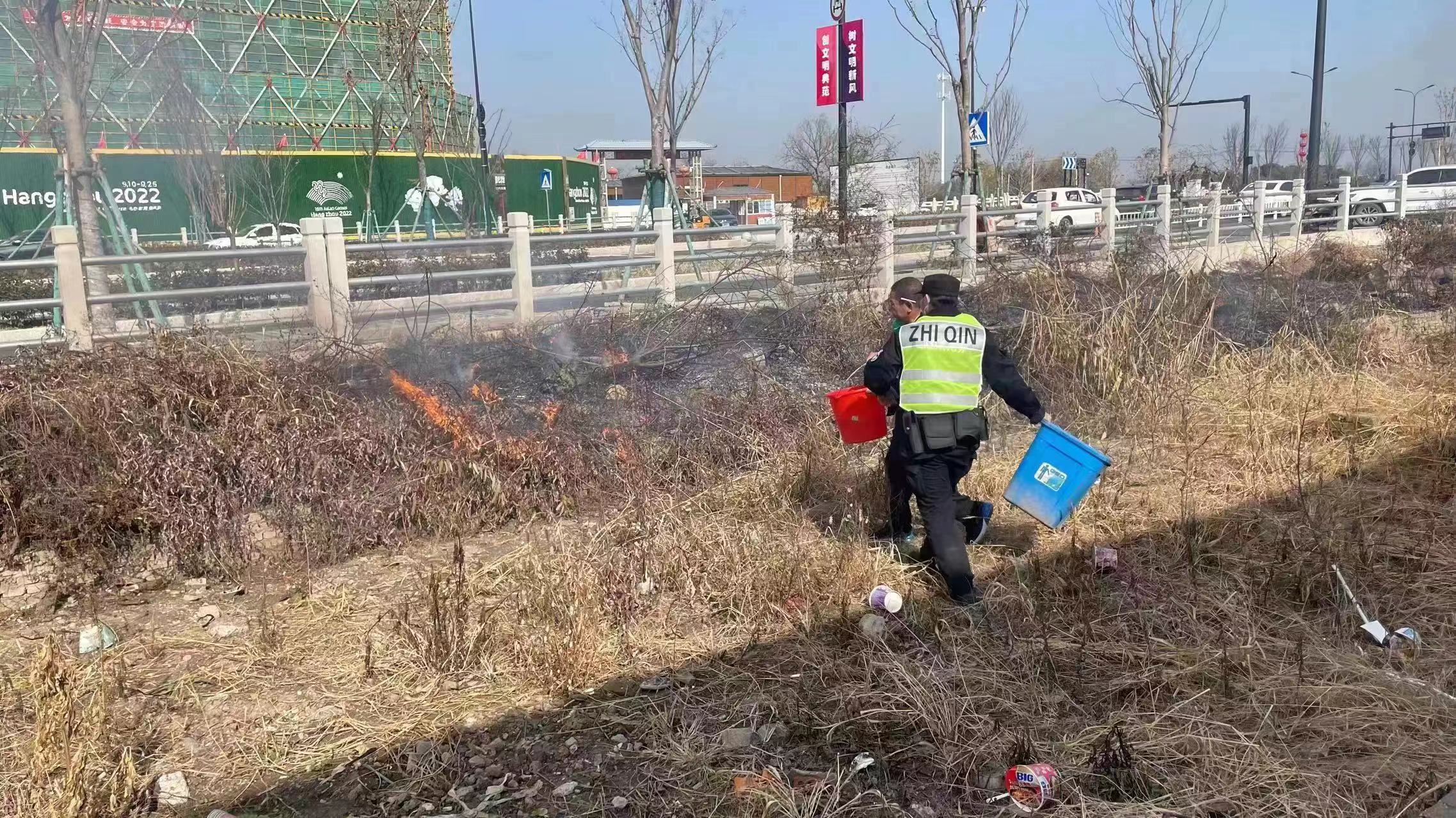孟颜和董怀义赶紧拿起路边的小垃圾桶,从附近河流中提水浇火,经过十几分钟的努力,野火终被扑灭。