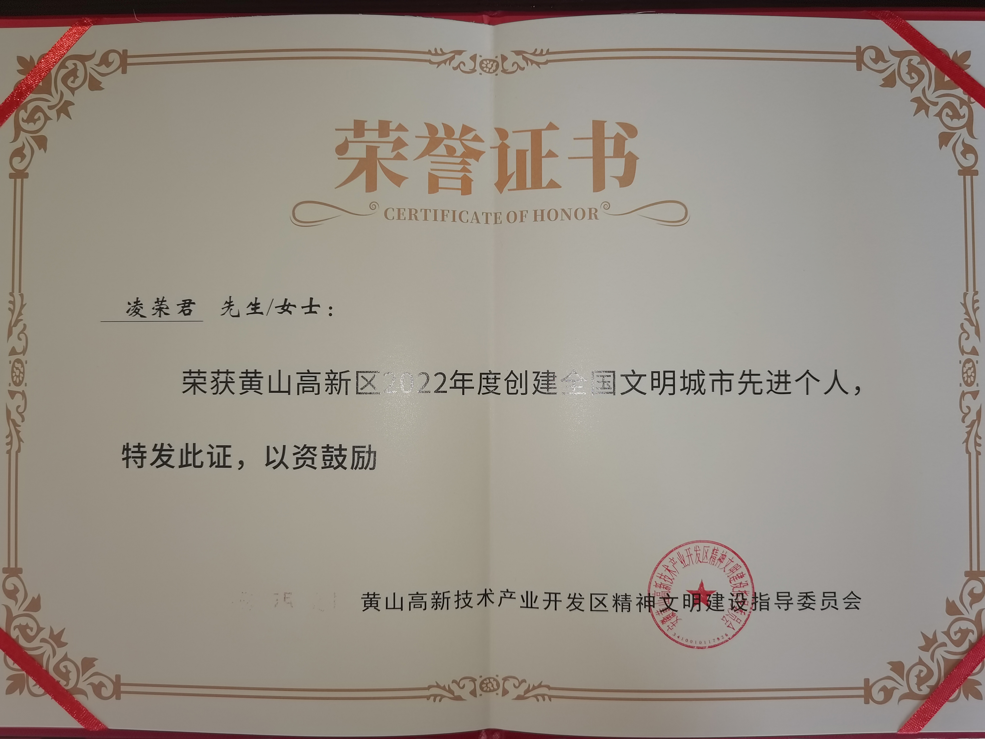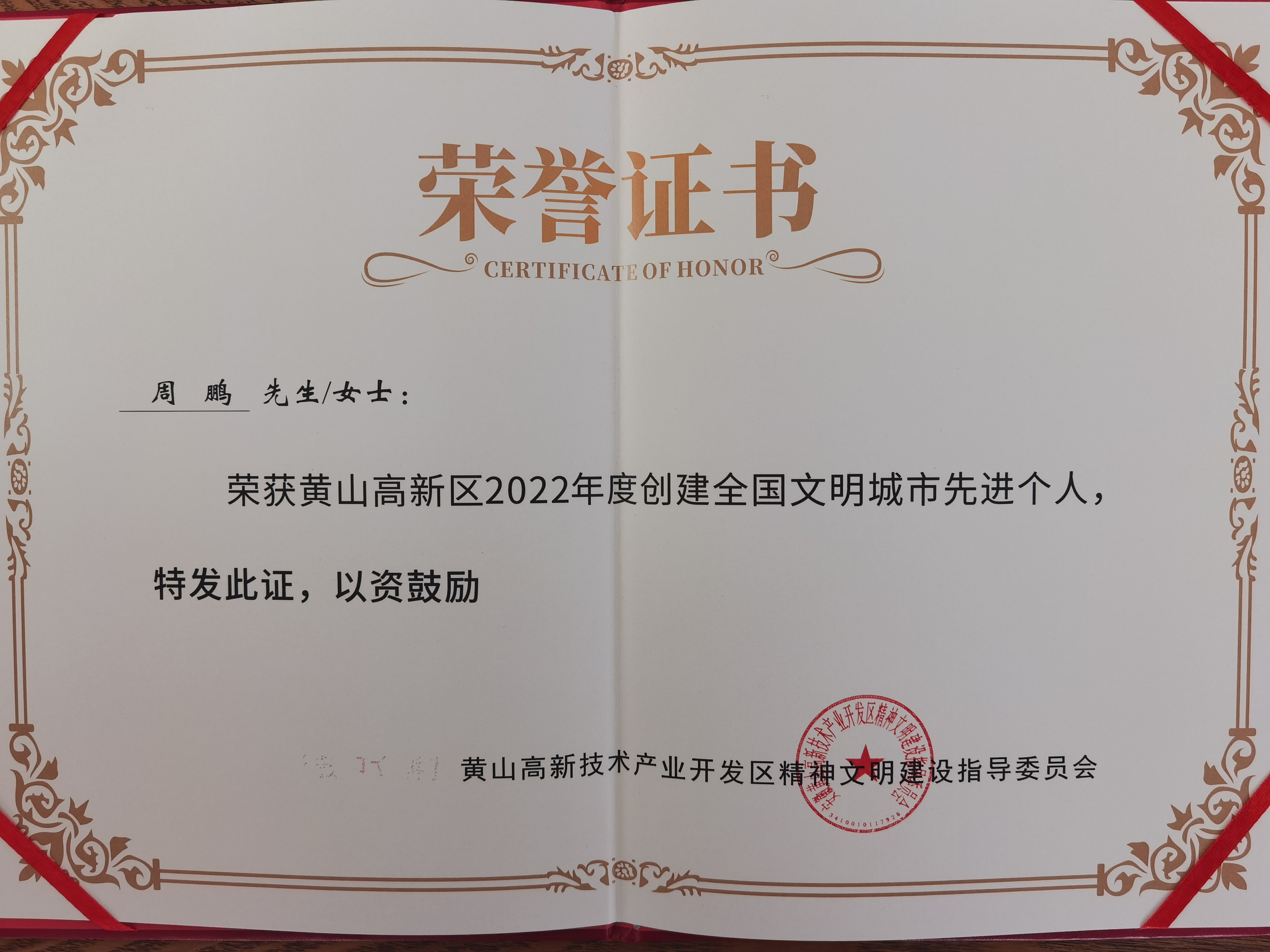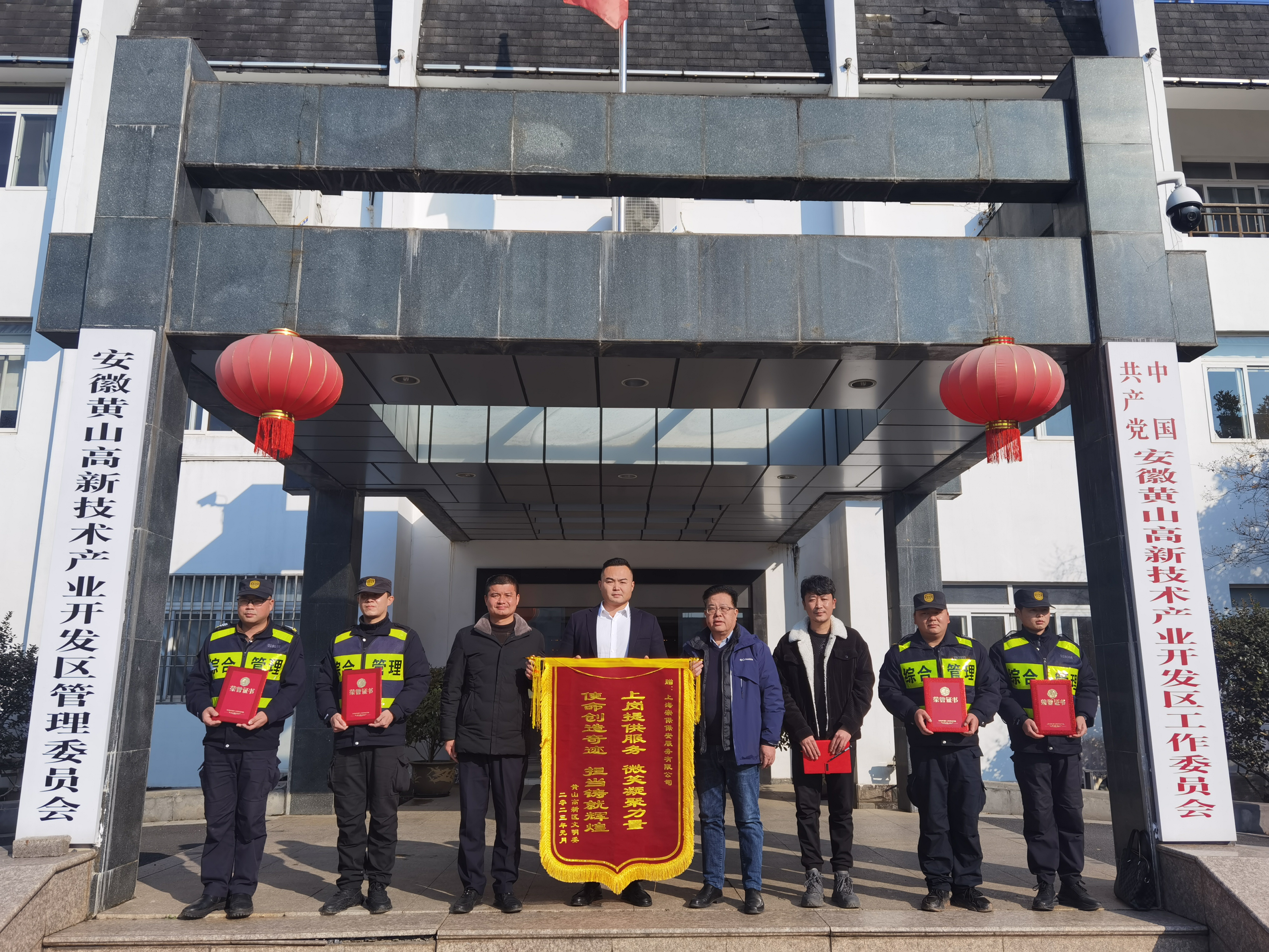 1月6日,安徽黄山市高新区管委会主任詹有成、高新区城市管理行政执法局局长刘岗和区文明办主任许振东为获评黄山高新区2022年度创建全国文明城市先进个人的宗保员工颁发证书,赠送锦旗和慰问金。
