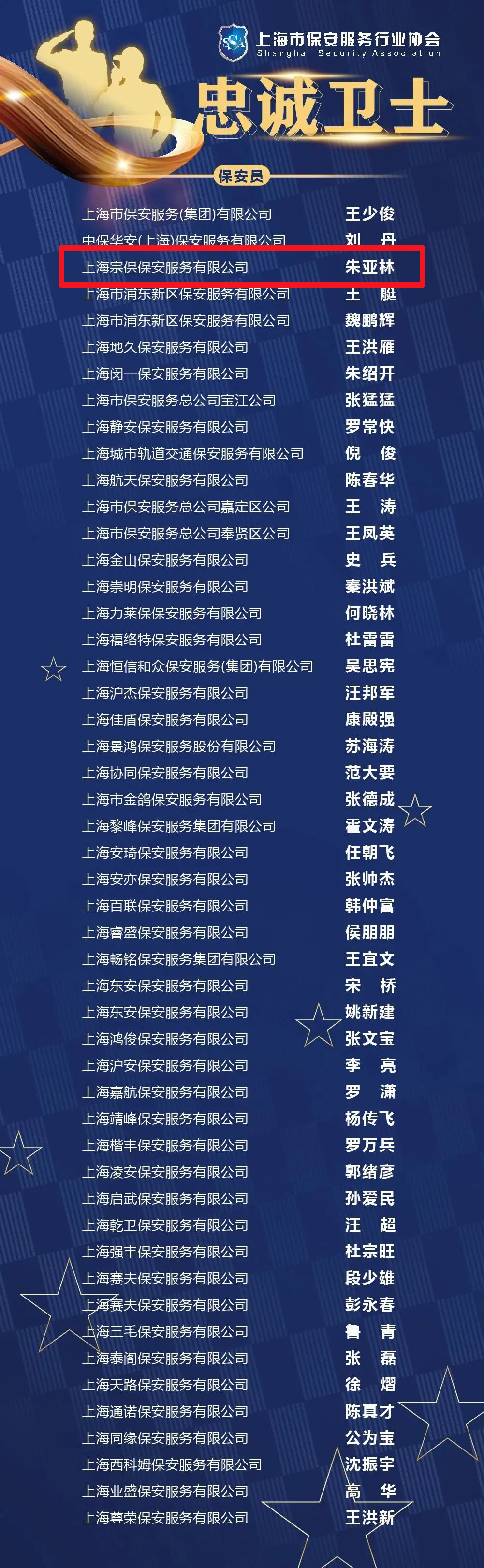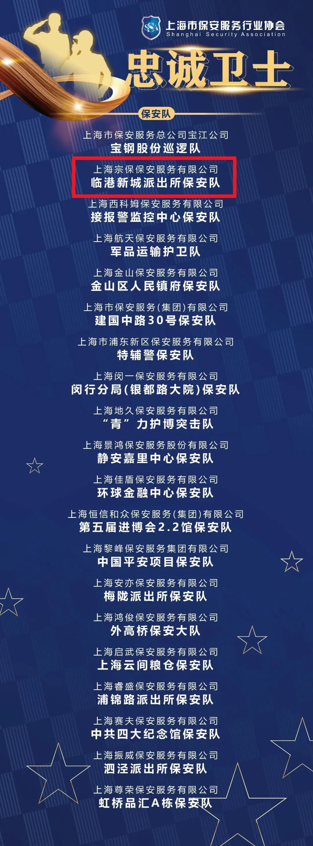 1月17日,上海市保安服务行业协会公布了“忠诚卫士”评选结果,宗保公司1个保安队和1名员工分获殊荣。