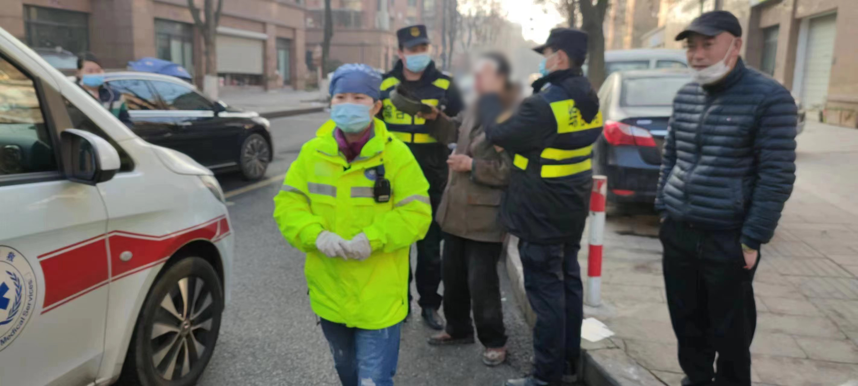 在等待救护车时,曹翔翔赶紧从旁边商店买来纸巾帮忙按压止血。很快,救护车和民警赶到现场,三人又协助医护人员将老人送上救护车,由救护车送其去医院进行治疗。