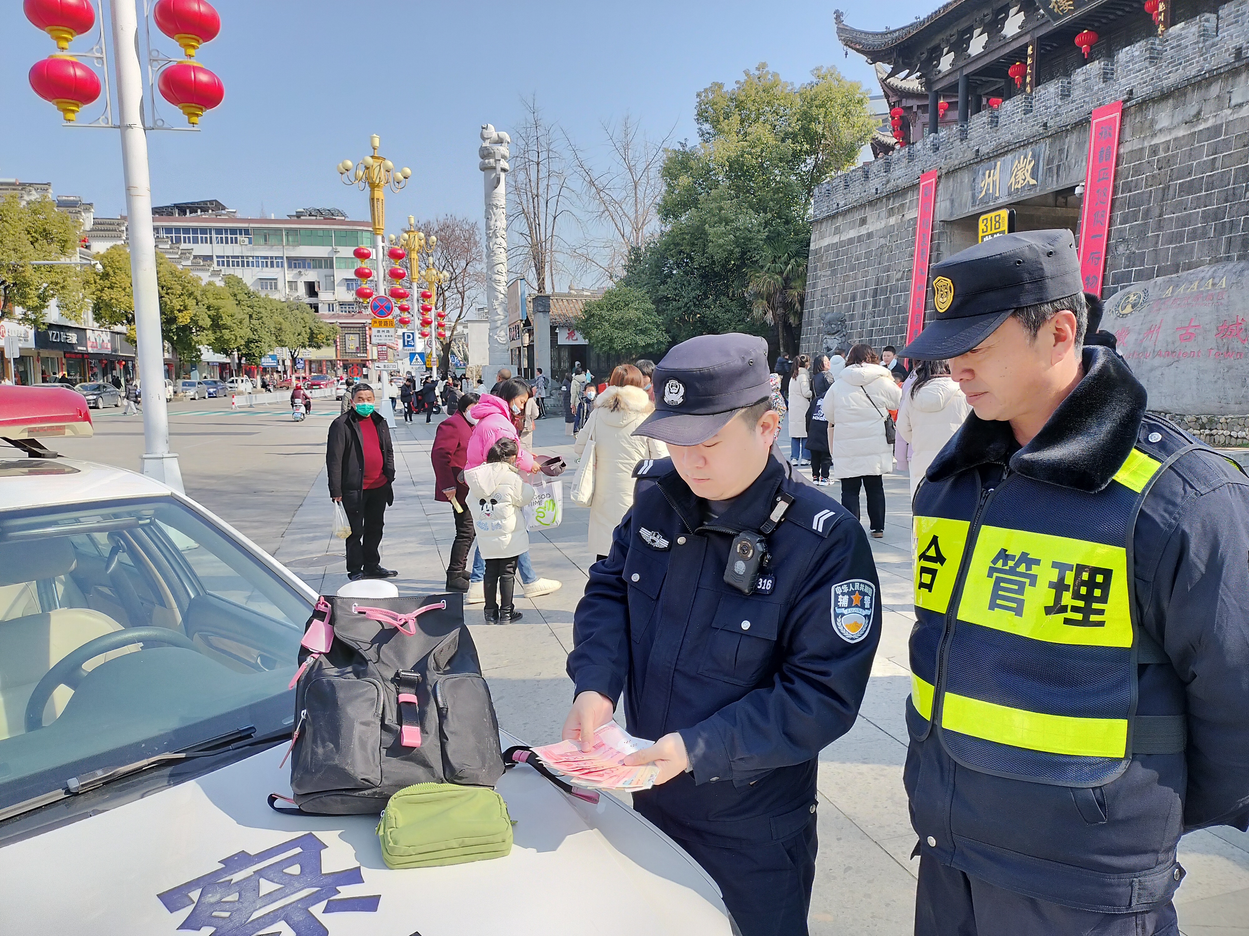 当日11:00,宗保公司歙县项目员工武汉臣巡逻至徽州古城徽园门口时,捡到一个挎包,内有1300元现金、身份证、银行卡等物品。考虑到重要物品丢失,失主一定很焦急,武汉臣便将挎包交给派出所民警帮寻失主。