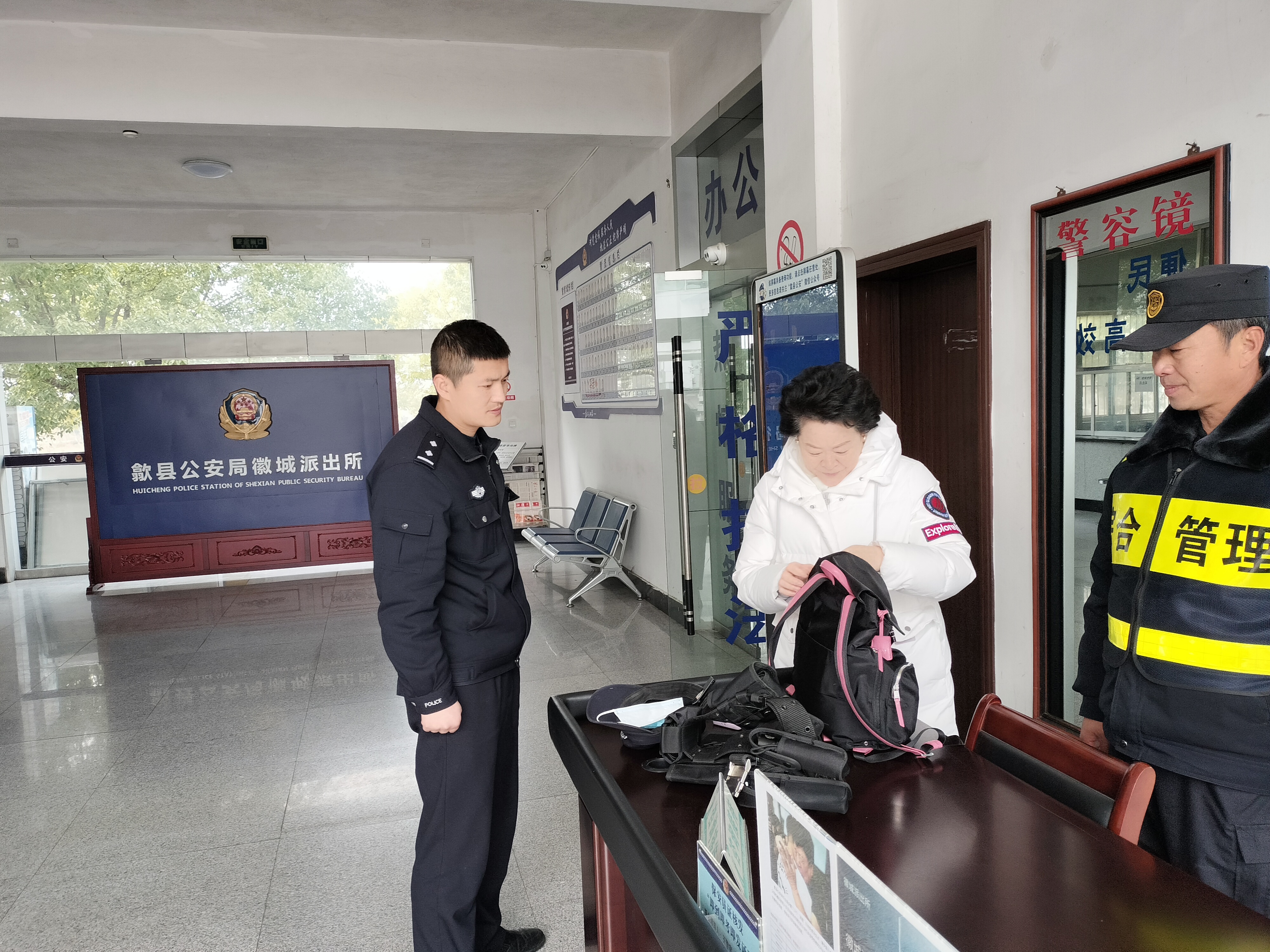 很快,民警根据身份证信息查询,与失主取得了联系。过了一会,一位身穿白色羽绒服的女士来到派出所认领失物,民警核实其身份后,把挎包交还给她。当女士得知是宗保员工捡到挎包,主动交给民警时,再三向员工武汉臣表示感谢。