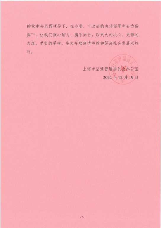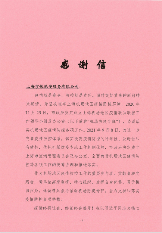 1月30日,上海市空港管理委员会办公室送来感谢信,感谢公司疫情期间对浦东机场疫情防控工作的大力支持。