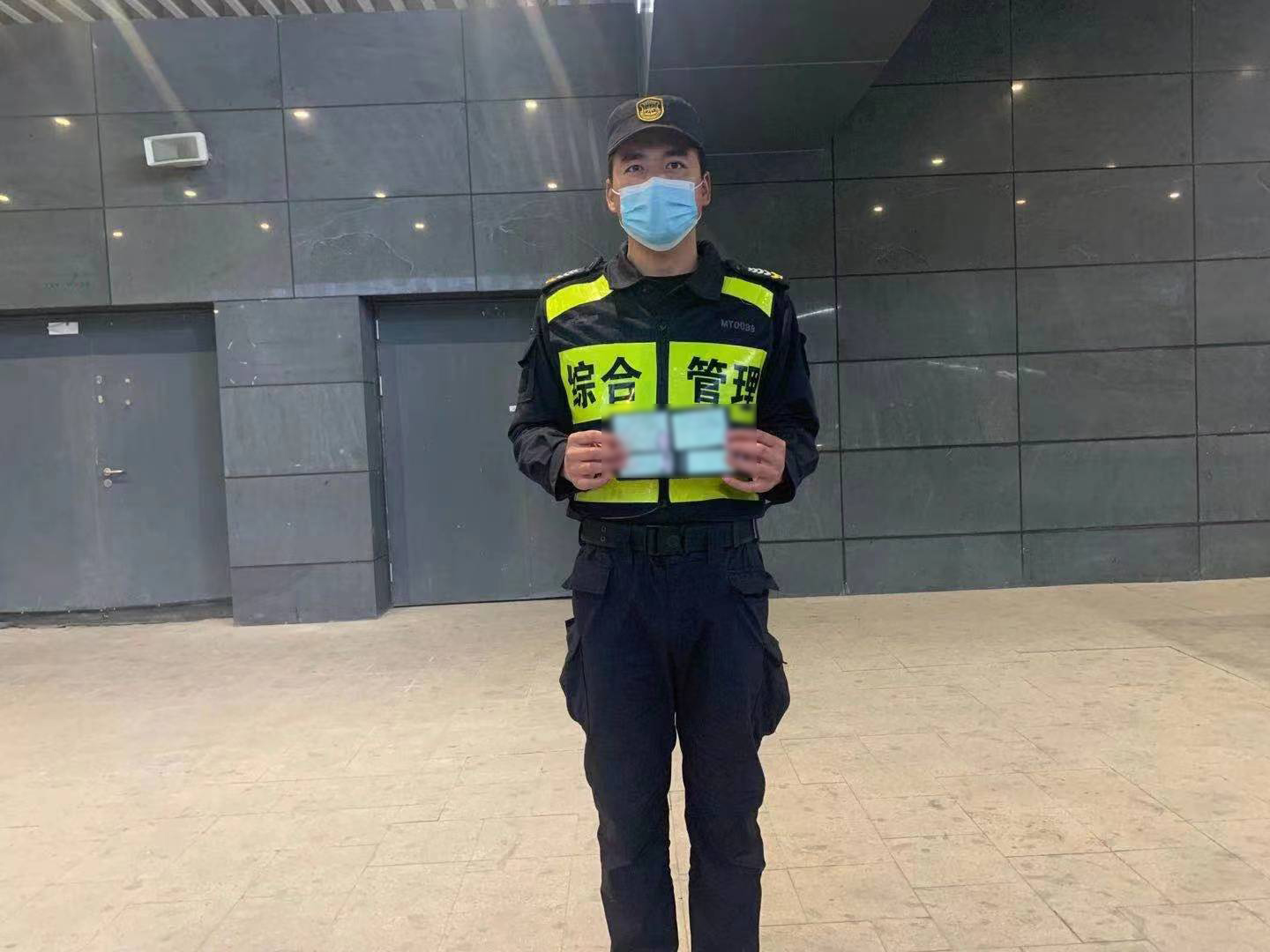 当日9:26,公司员工王浩在莘庄地铁站北广场值勤时,捡到一个背包,随即将情况报告了项目负责人,并按指示在原地一边值勤,一边等待失主。