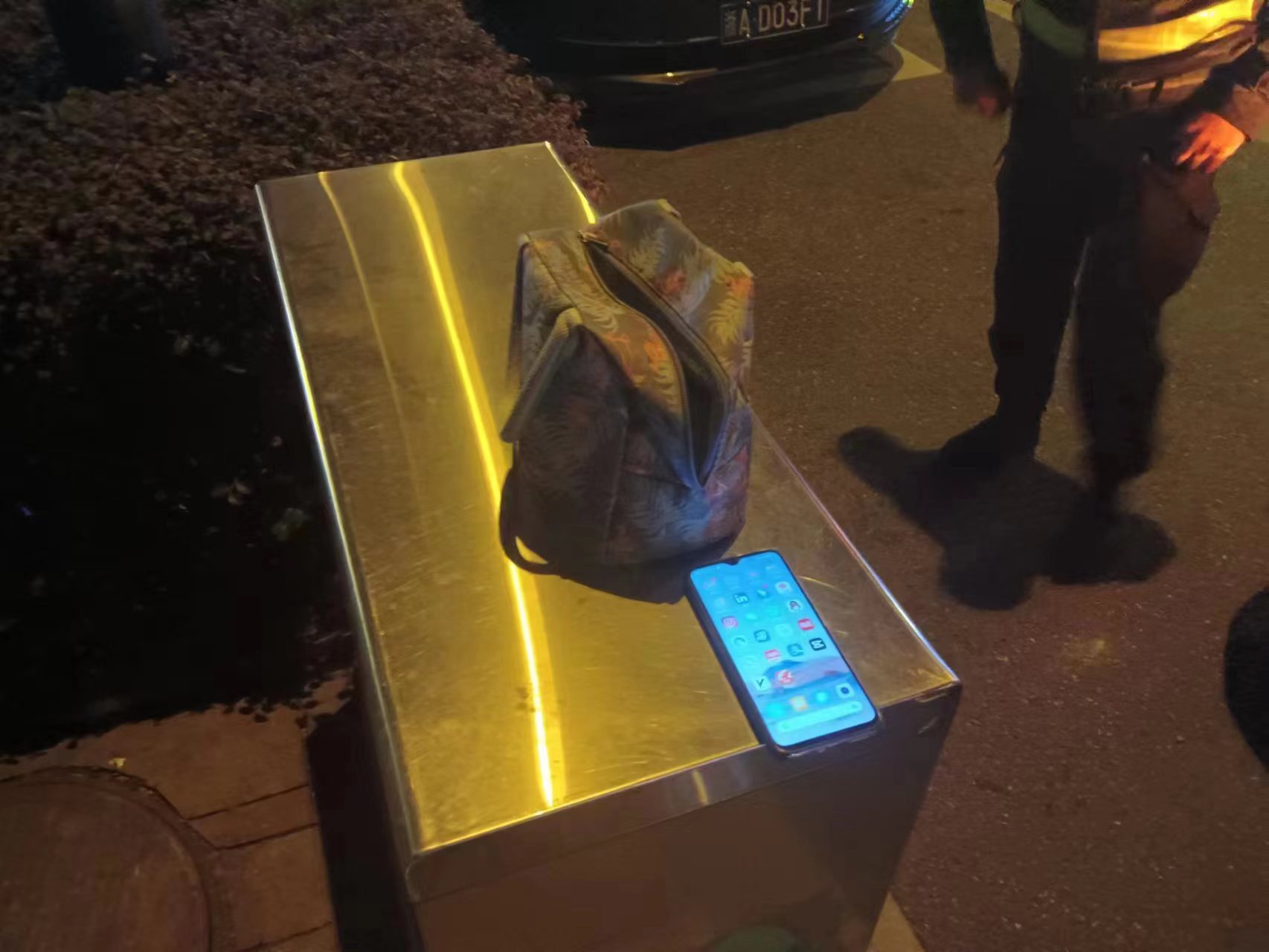 当天18:15,公司员工王旗在沈梅东路275号3号地库口疏导车辆时,捡到一个手提袋,内装有公交卡、学生卡、图书卡、钥匙及若干现金等物品。王旗随即将情况报告了班组长,并按指示在原地等待。