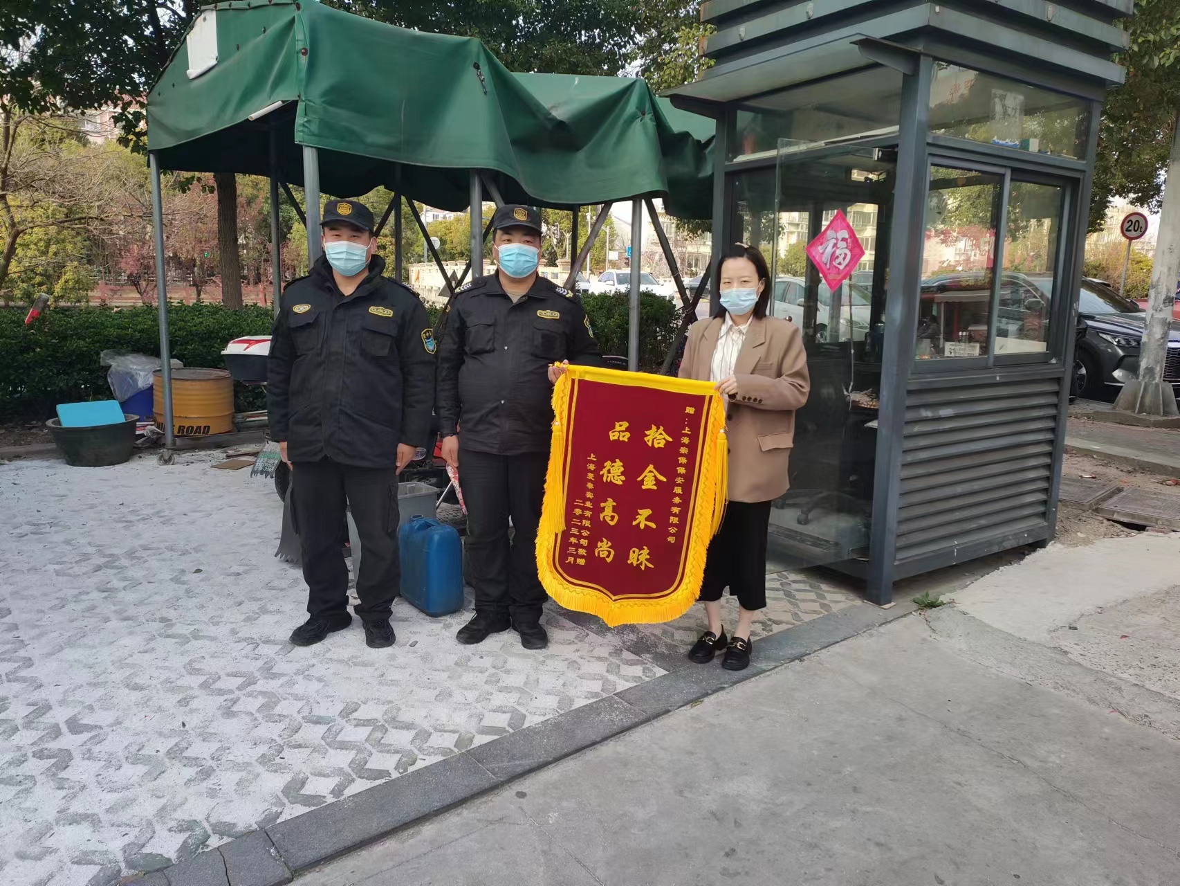 3月16日,宗保公司驻周浦区域海印·哈邻里项目员工关毅亮收到市民送来的一面绣有“拾金不昧 品德高尚”的锦旗,感谢他拾金不昧、想法交还的行为。