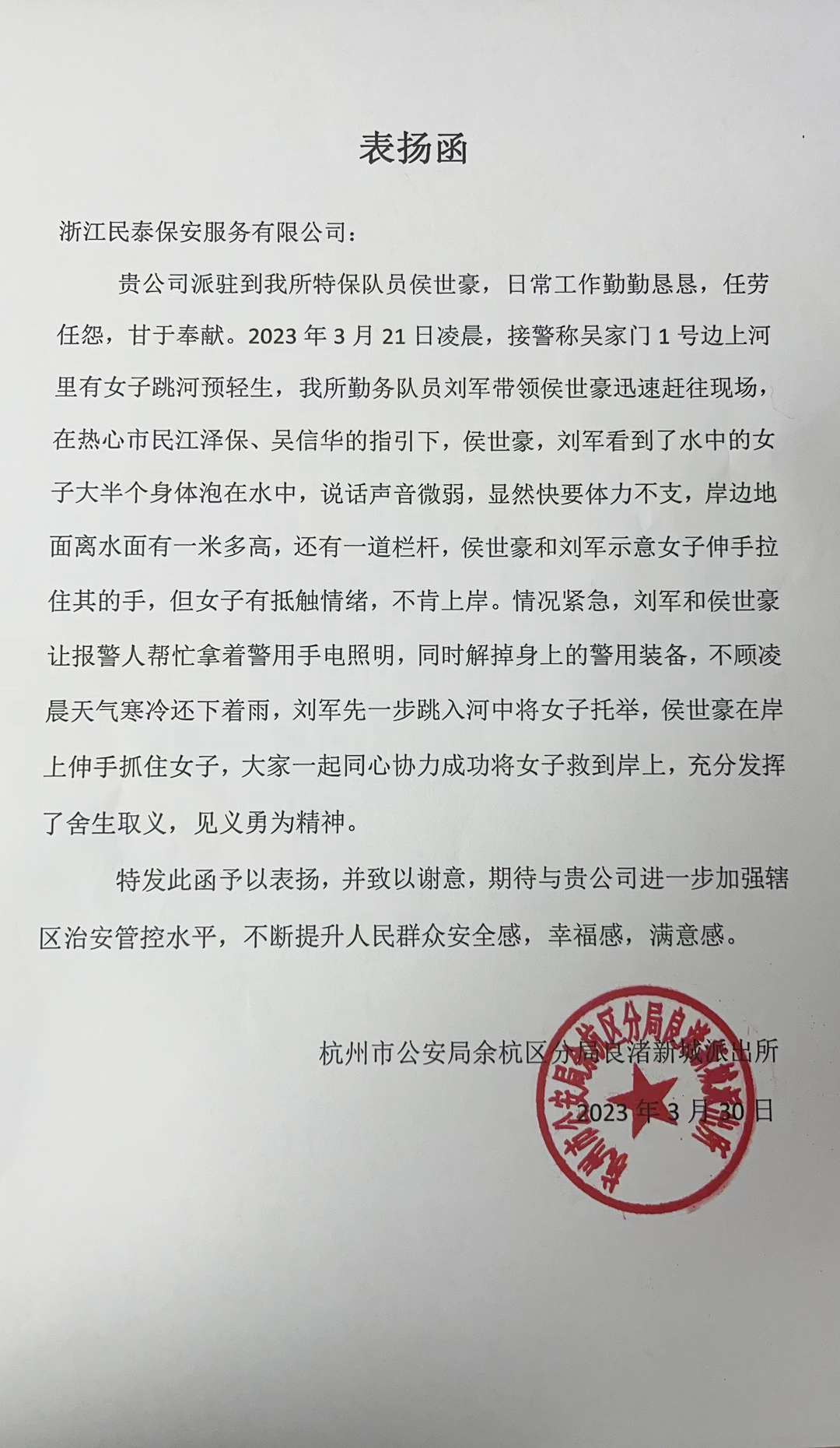 3月21日,浙江民泰公司驻杭州市余杭区良渚新城派出所辅助项目员工合力施救跳河轻生女子,甲方特致函给予表扬。