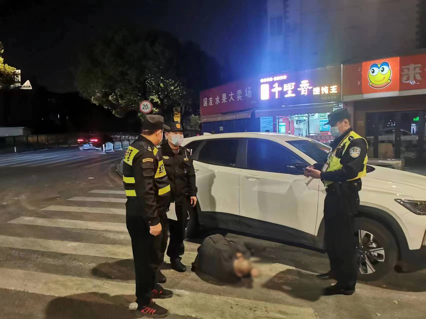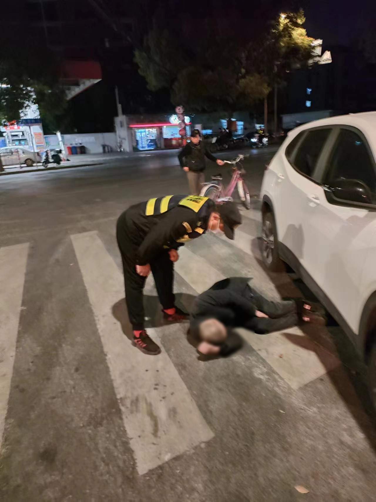 当日23:20,公司员工刘旭和胡全巡查至杨思路后长街路口时, 发现一位老人躺在一辆白色SUV车旁一动不动。两人立即上前蹲下察看,老人伴有浓烈酒味,初步判断因饮酒过量,导致昏睡不醒。