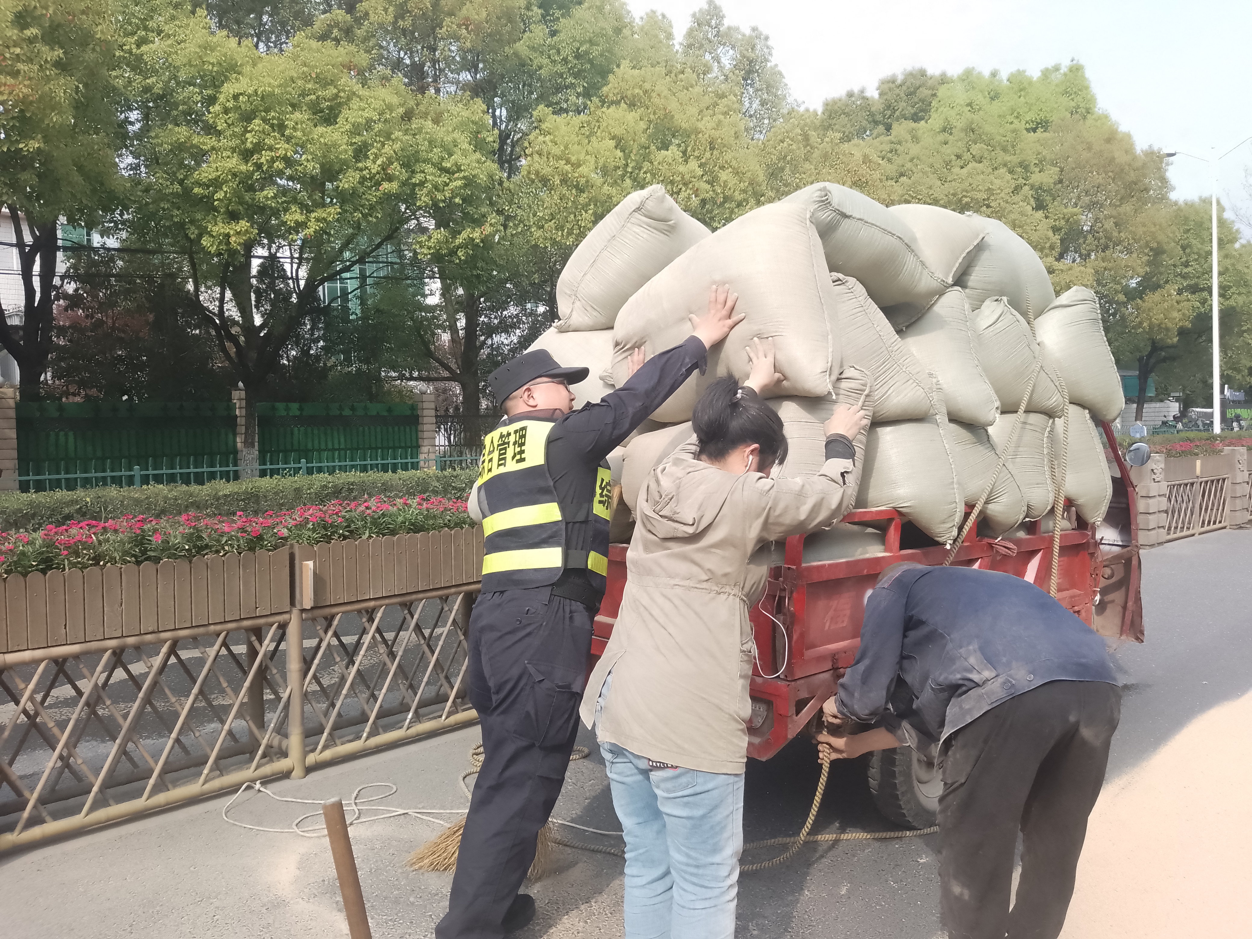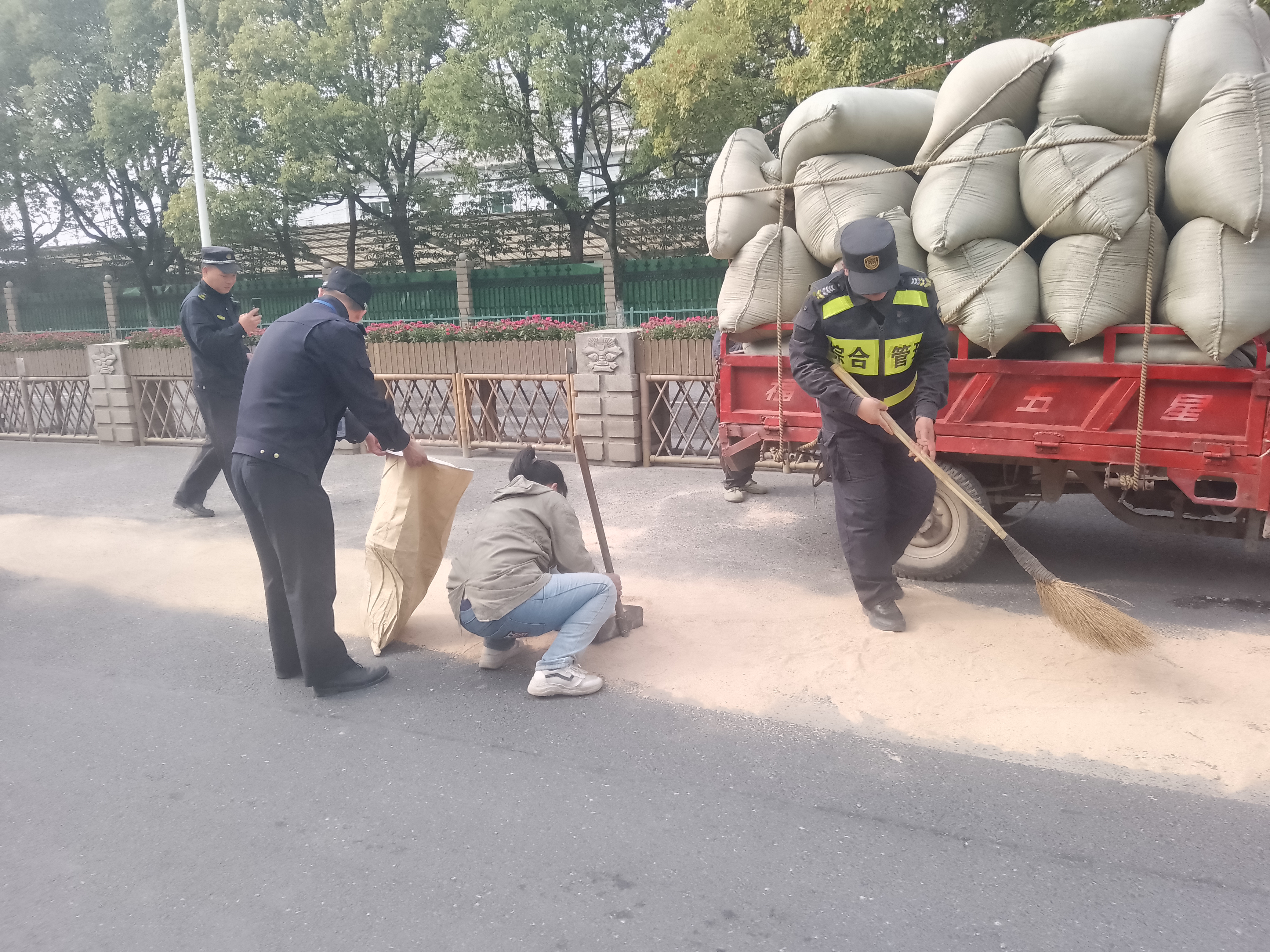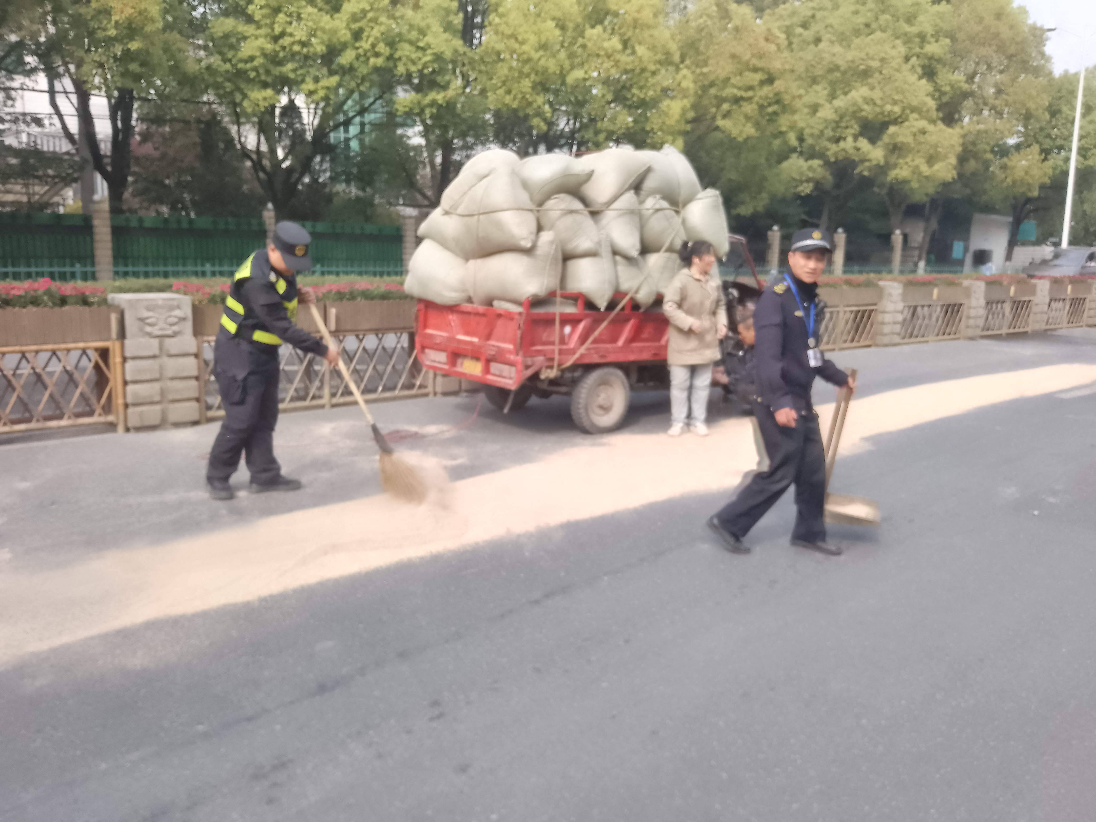 为消除安全隐患,王向华立即追上三轮车驾驶员,将其拦下告知,黄华则从附近店铺借来扫帚清理路面散落木屑。随后,两人又协助三轮车驾驶员将整理好的袋子重新装上三轮车,进行捆绑固定。