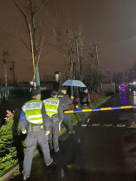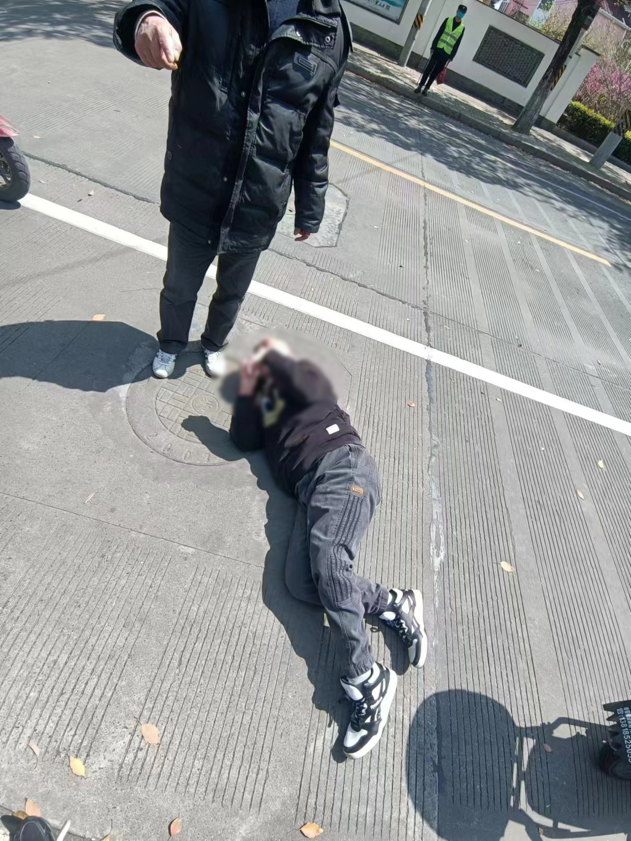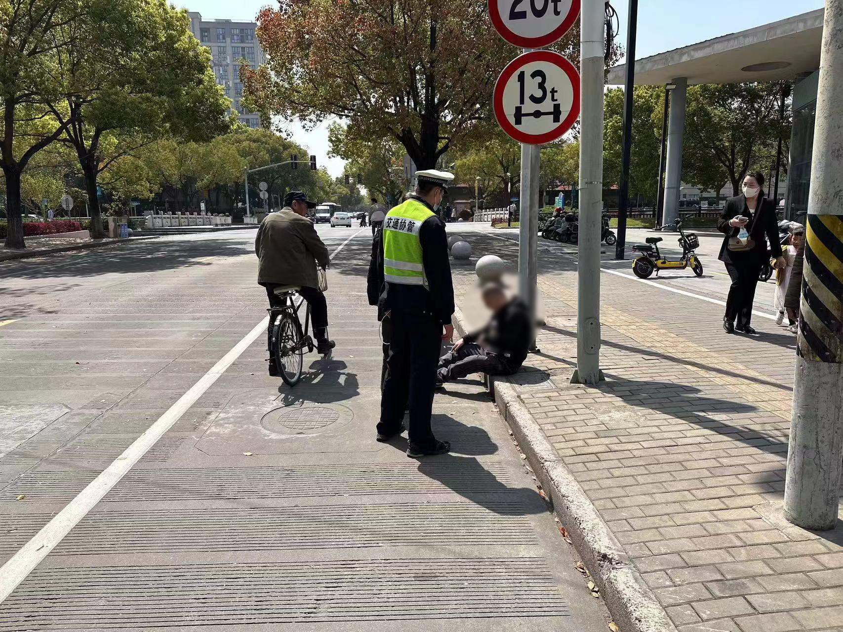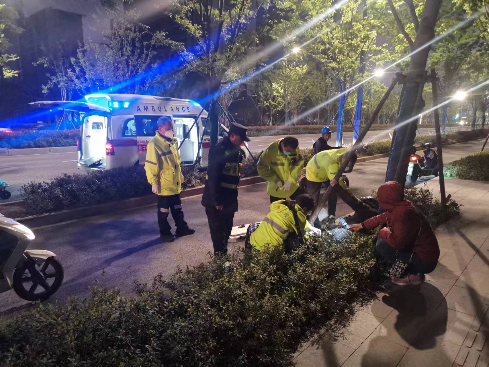 当天20:28,公司员工王保刚和黄文在杭行路与金源路交叉口巡逻时,发现一男子斜靠在绿化带的树下,不远处有一辆电瓶车横躺在路上。