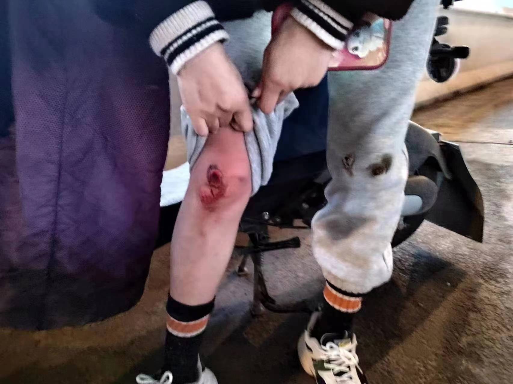 原来女子骑车时被高架桥上方掉落的水泥渣砸中,导致电动车失衡摔倒在地。女子说自己膝盖受伤了很痛,站不起来,要叫救护车到医院看看。