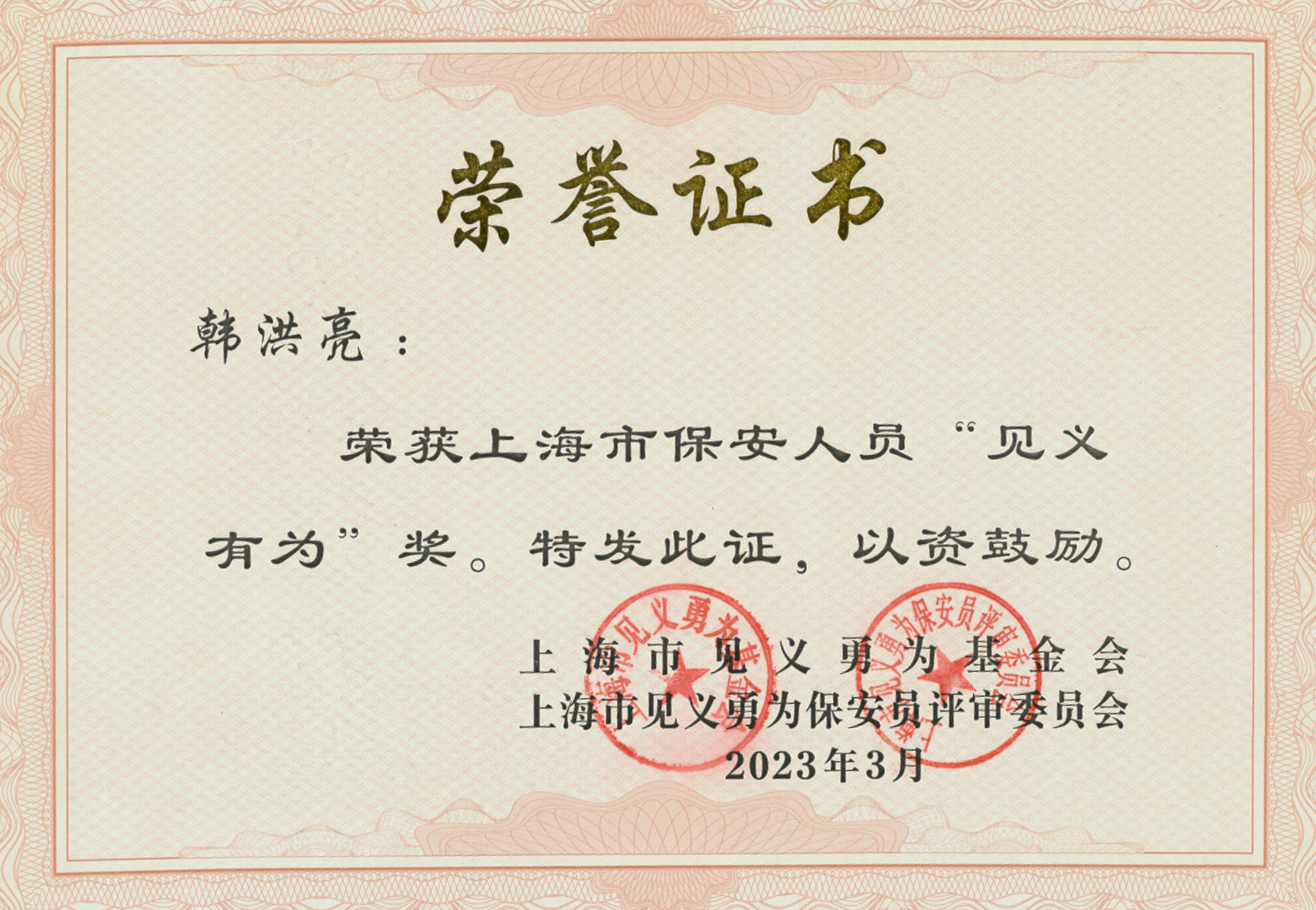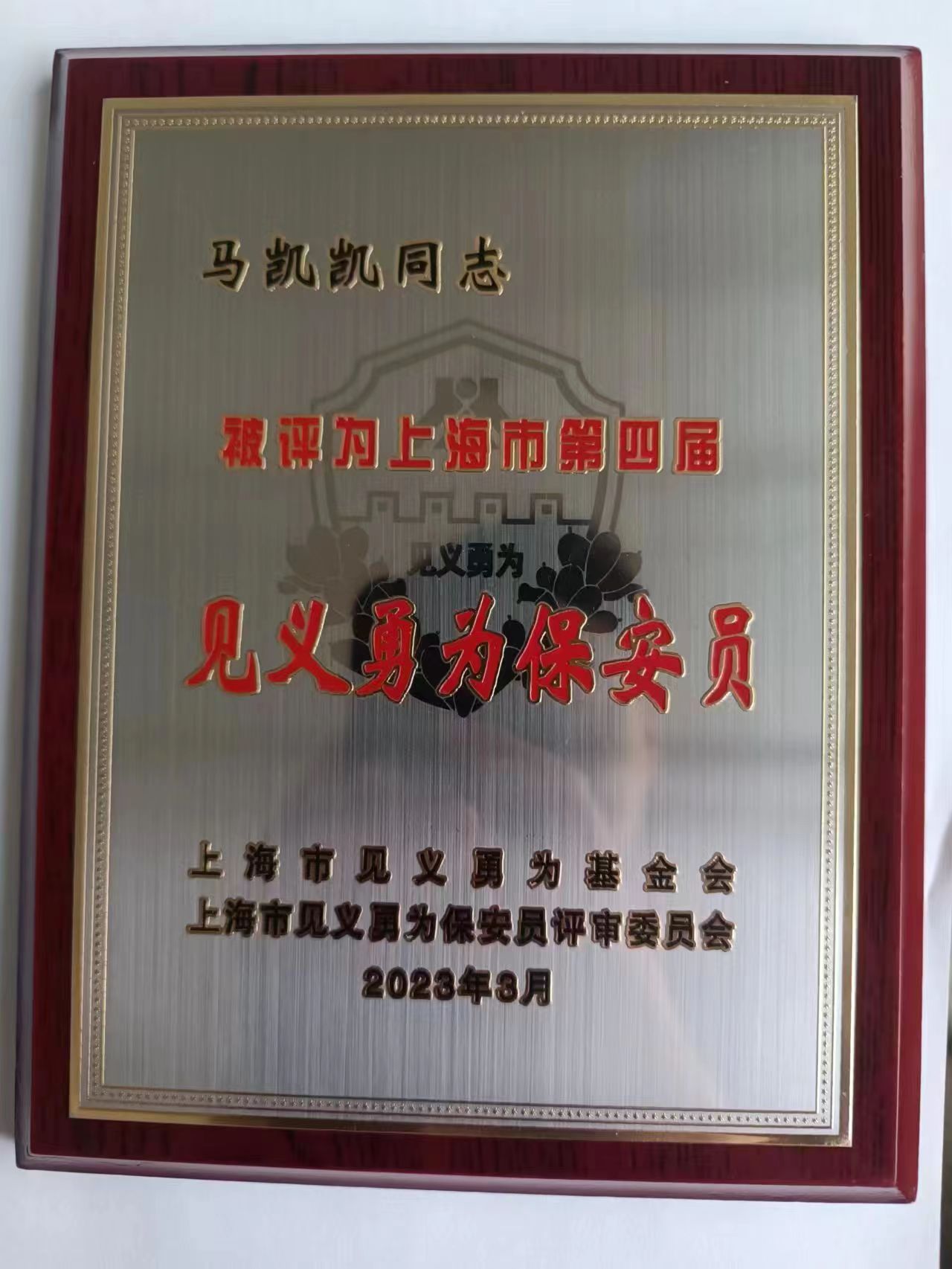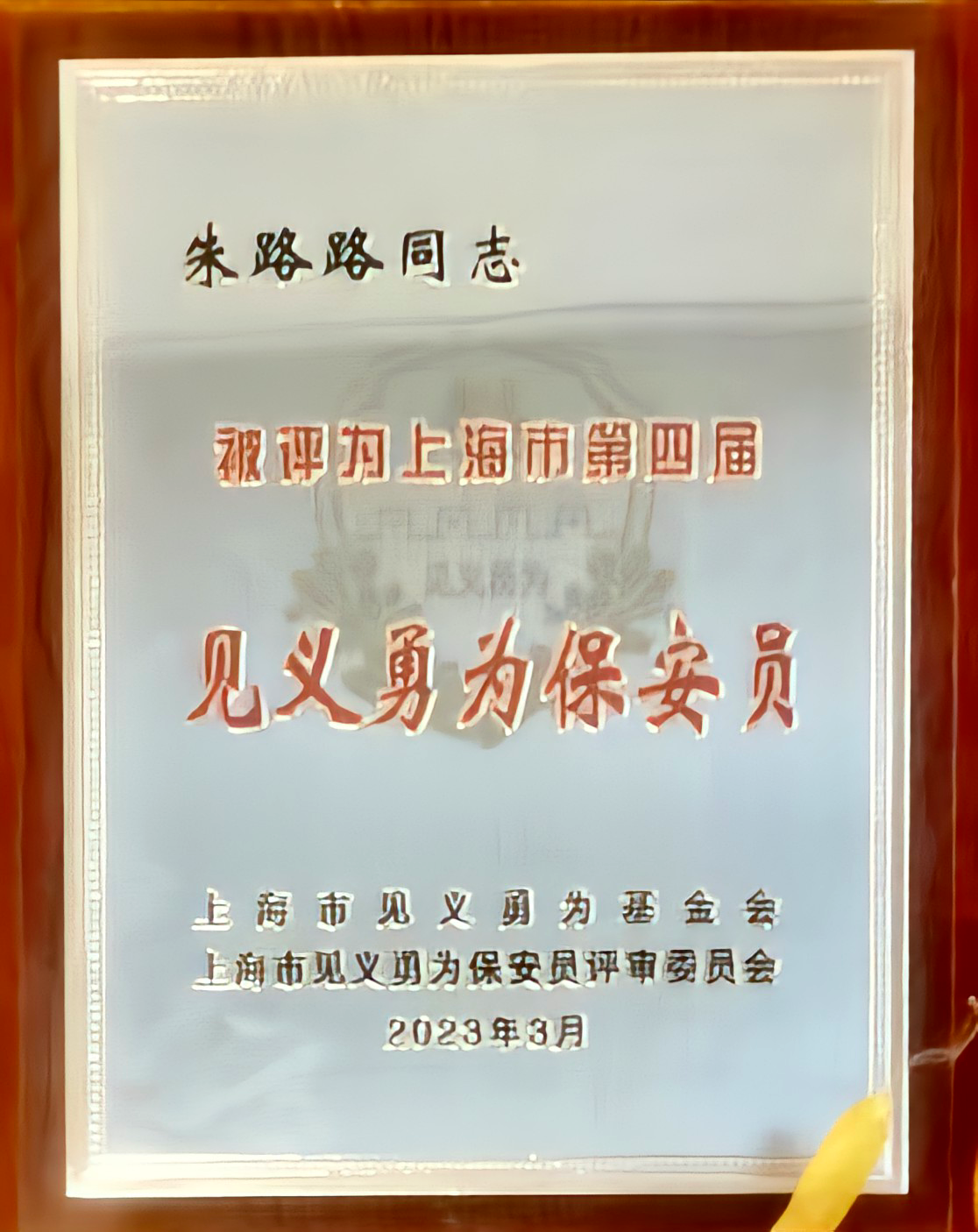 宗保公司员工朱路路、马凯凯被授予“上海市见义勇为保安员”称号,韩洪亮荣获上海市保安人员“见义有为”奖。