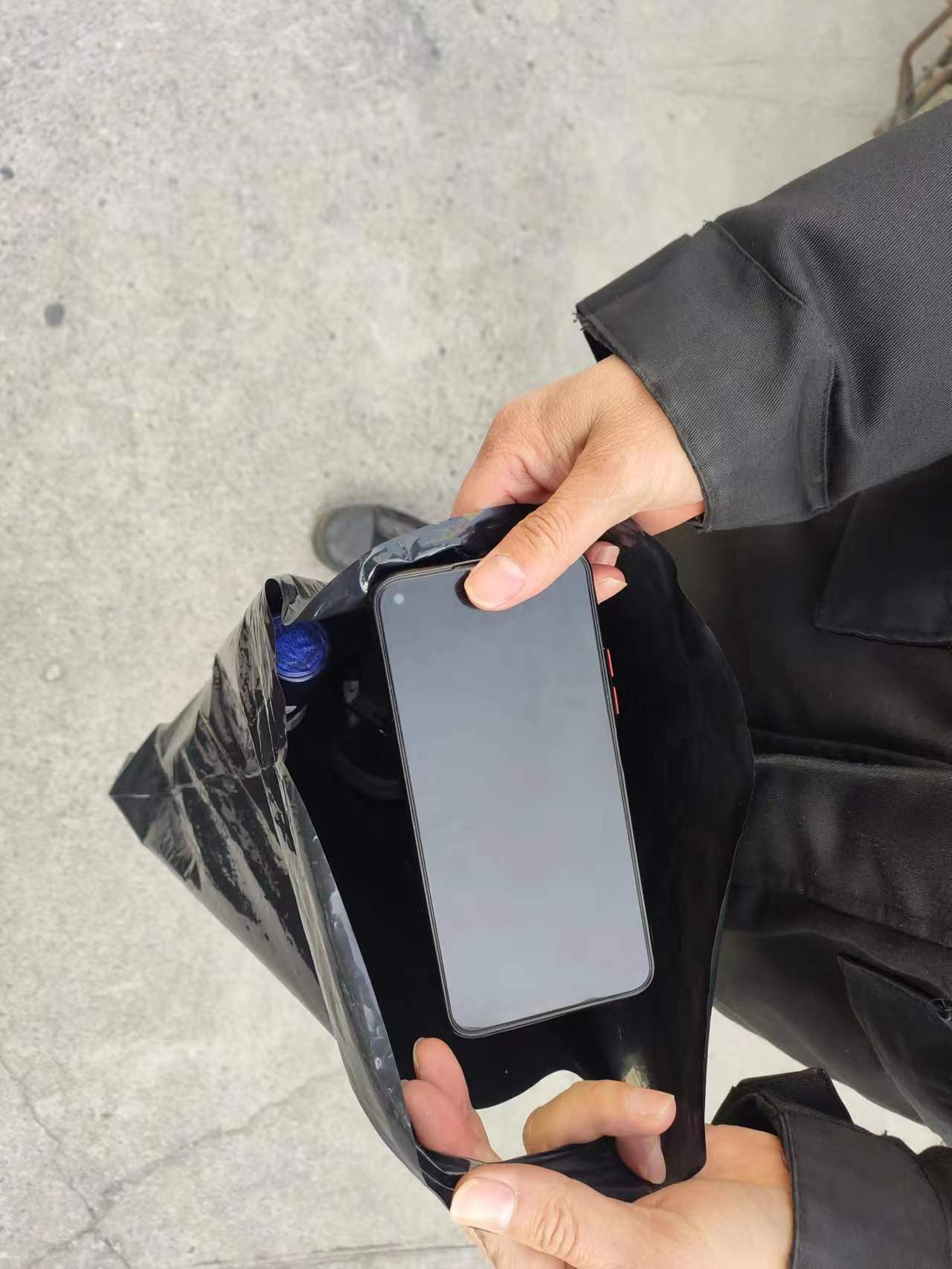 4月12日23:15,公司员工江代华在沈梅东路值勤时,捡到一个黑色手提袋,内有一部华为手机和两瓶洋酒,随即将情况报告了班组长,并按指示在原地等待。
