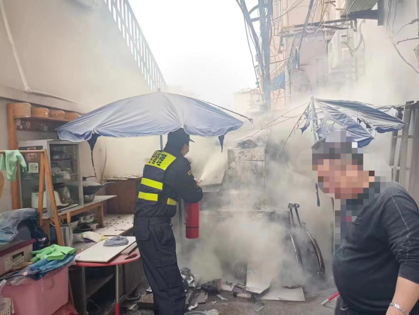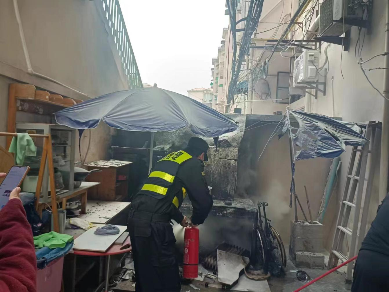原来是小区楼道里堆放的杂物着火了,熊统超急忙将火情报告当班组长和物业岗亭值班人员,并赶紧奔向物业门岗拿起两个灭火器进行扑救,有效地控制住了火势蔓延,消除了安全隐患。