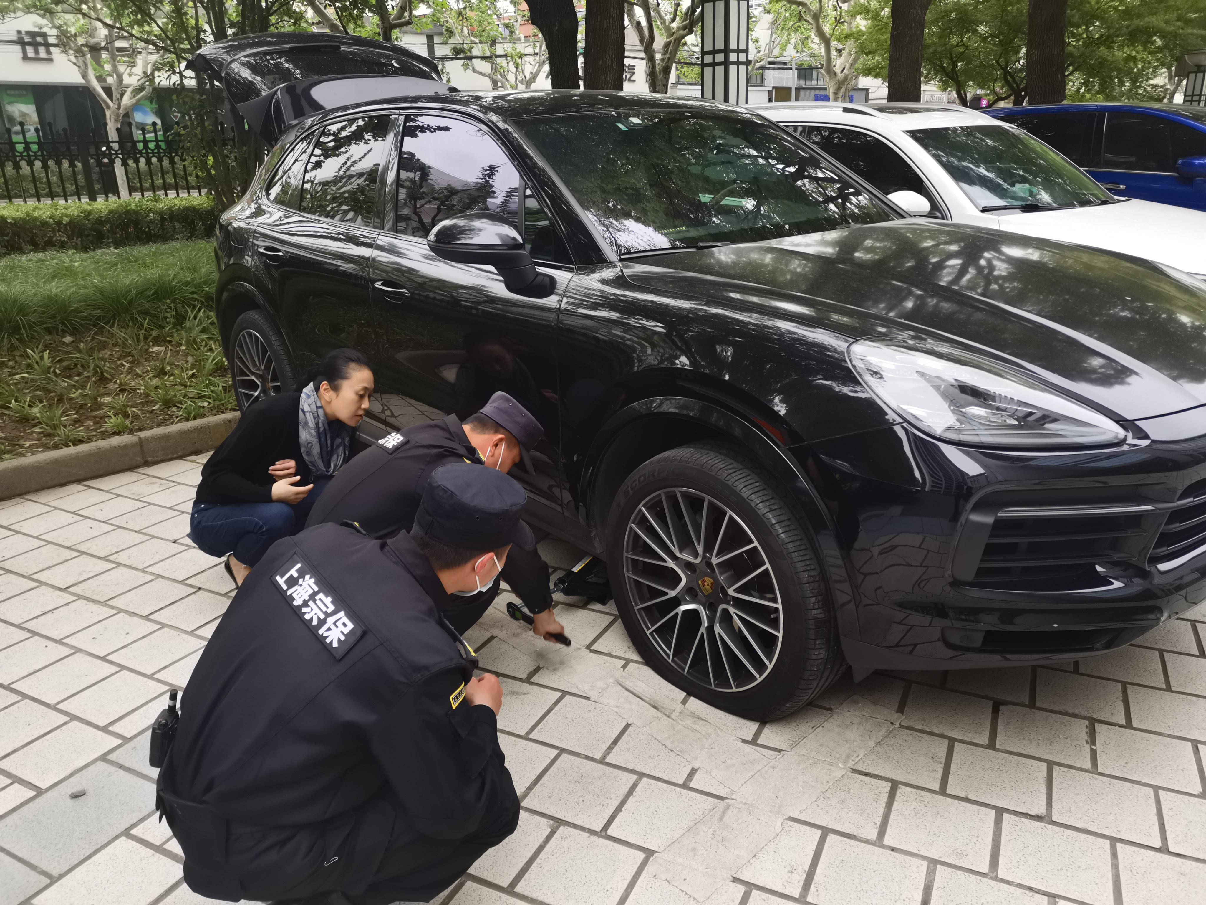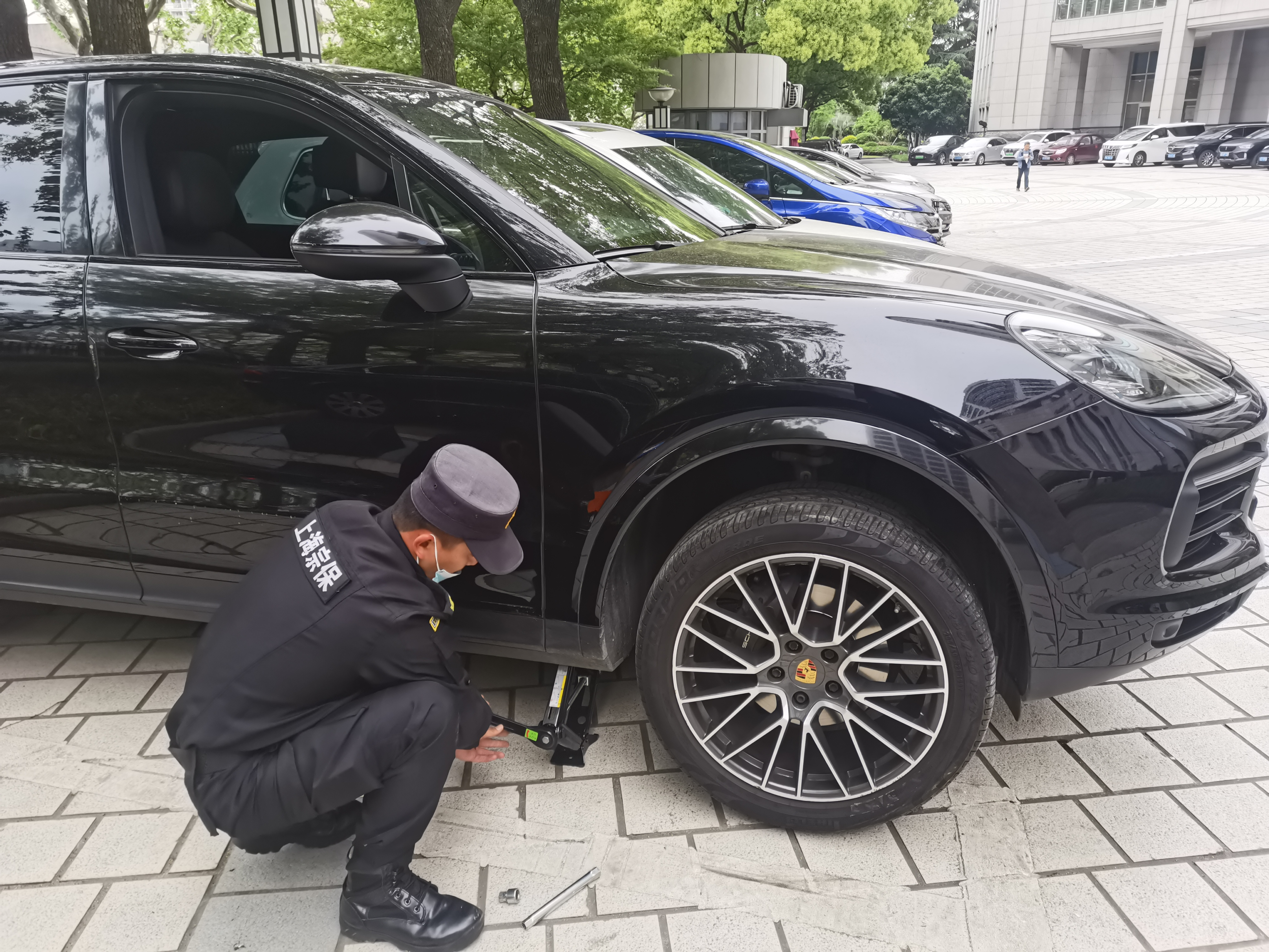 4月25日,宗保公司驻闵行区市委党校项目员工帮助参训学员更换轮胎。