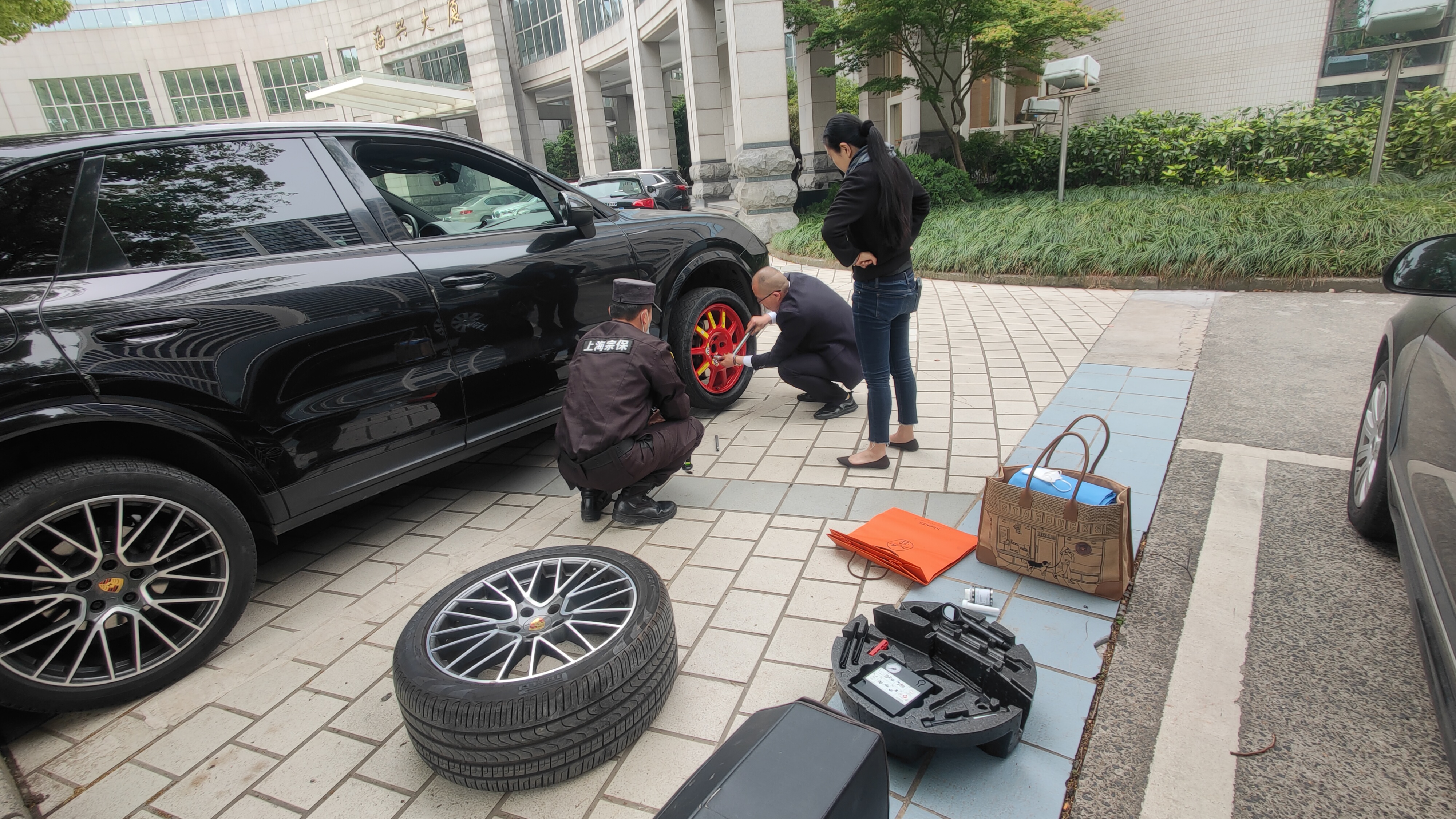 当天13:50,公司员工袁男男和范俊在党校正门警卫室值勤时,遇到一名参训学员急切求助,称自己车子的右前轮胎瘪了没有了胎压,而自己又不会更换轮胎,能不能帮帮忙换换轮胎。