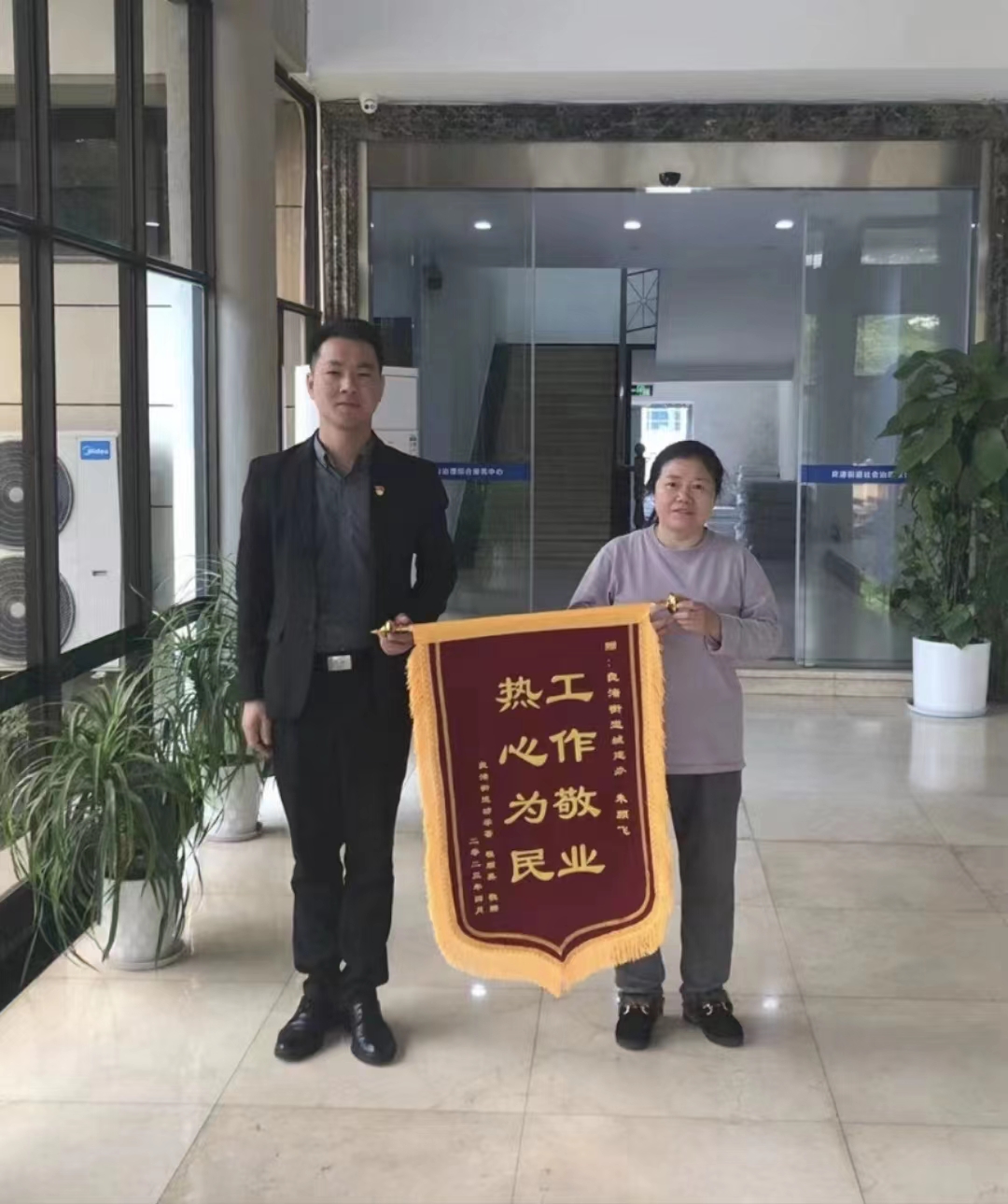 4月28日,浙江民泰公司驻杭州市余杭区良渚物流项目收到市民程阿姨送来的一面绣有“工作敬业 热心为民”的锦旗,感谢公司员工帮助她及时找回重要文件。