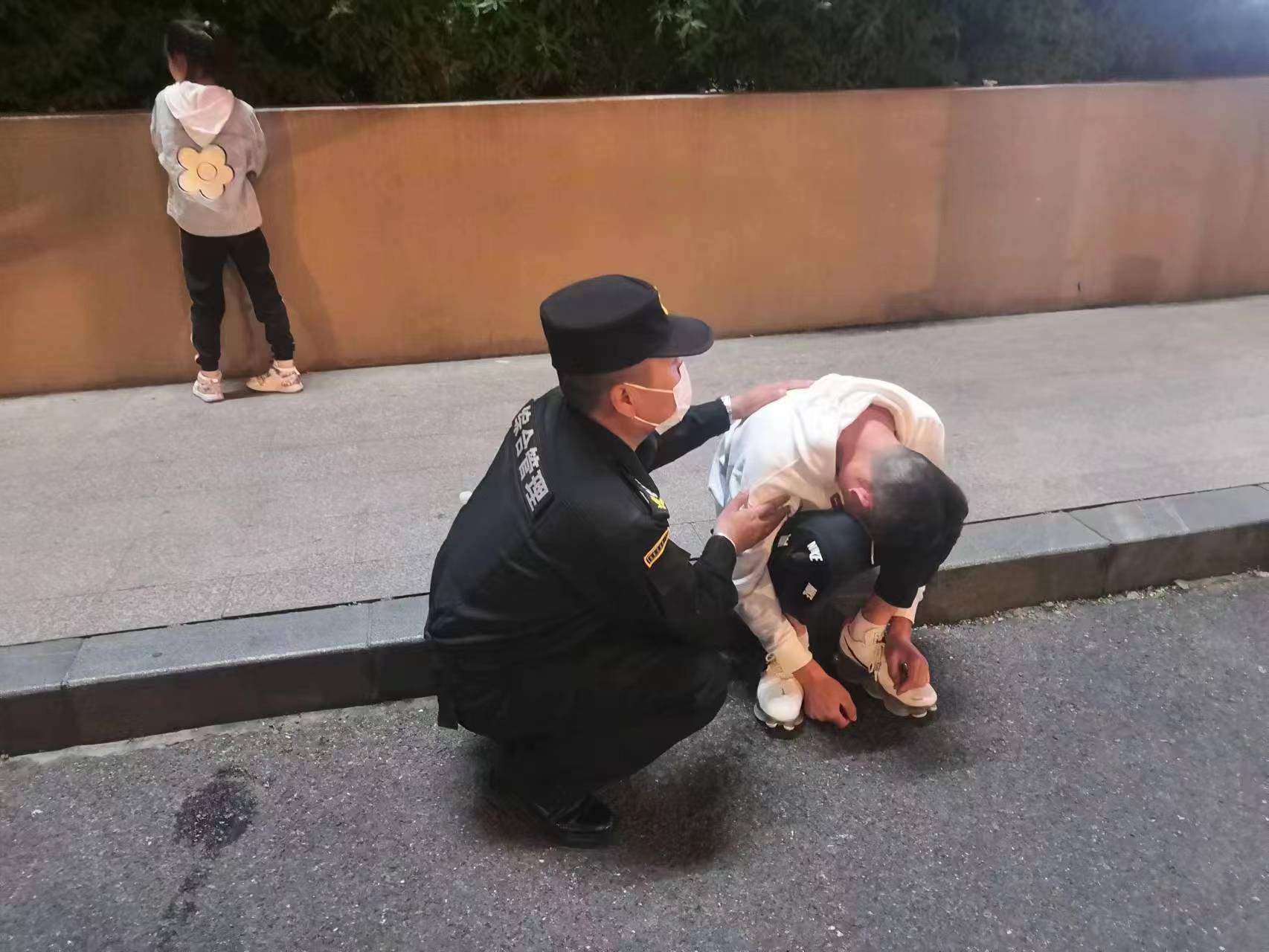 牛洪武赶紧坐到路边,将男子移躺在自己大腿上,防止呕吐物堵塞喉管造成窒息,李照明则询问现场有没有人认识该男子。这时,一位约六七岁左右的小女孩称醉酒的男子是她爸爸,并说出了家人的电话。