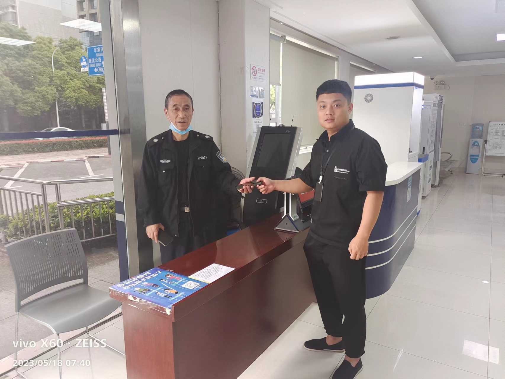 当日8:00,公司员工陈昊在周浦派出所门口的自行车停车点值勤时,捡到一部华为手机,随即将情况报告了班组长,并按指示在原地等待。