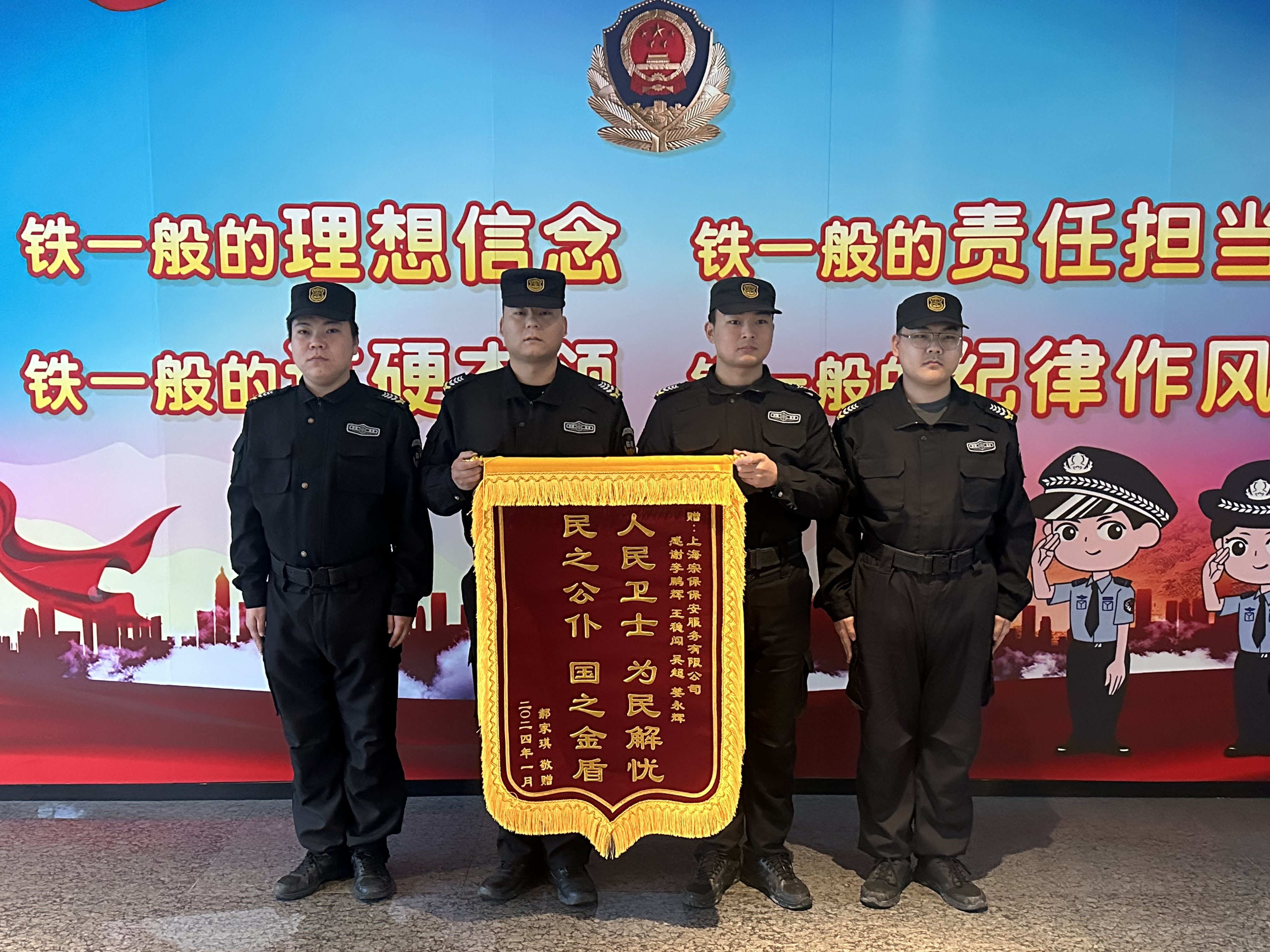 1月29日,宗保公司驻浦东新区公安分局临港新城派出所辅助项目收到市民郝女士送来的一面绣有“人民卫士 为民解忧 民之公仆 国之金盾”的锦旗,感谢公司员工帮其找回钻戒的助人行为。