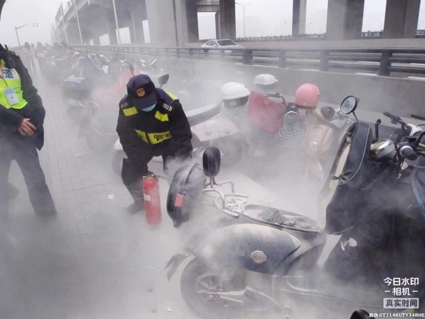 此时,电瓶车已冒起白烟,并不断有火苗窜出,一旦电瓶爆炸极易发生危险。徐雷赶紧请周围群众避让,随后拿起灭火器对准电瓶车持续喷射,很快冒火部位被扑灭,避免了危险事故发生。