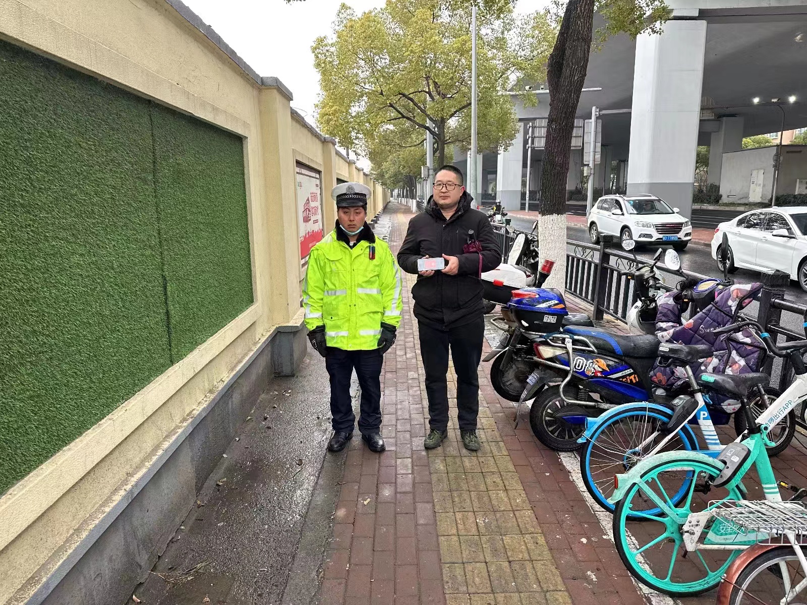 1月30日8:50,宗保公司驻闵行区华漕护校项目员工阿克补万在北翟路南华街路交叉口值勤时,捡到一部OPPO手机,询问四周人员无果后,随即将情况报告了项目负责人,并按指示留在原地等待失主。大约过了20分钟,一男子打来电话寻找手机,阿克补万便与男子约好碰面时间地点。很快,一位身穿黑色外套的男子赶到现场,经核实确认其是失主后,阿克补万将手机交还给了他。男子拿着手机十分高兴,连连向宗保员工道谢。