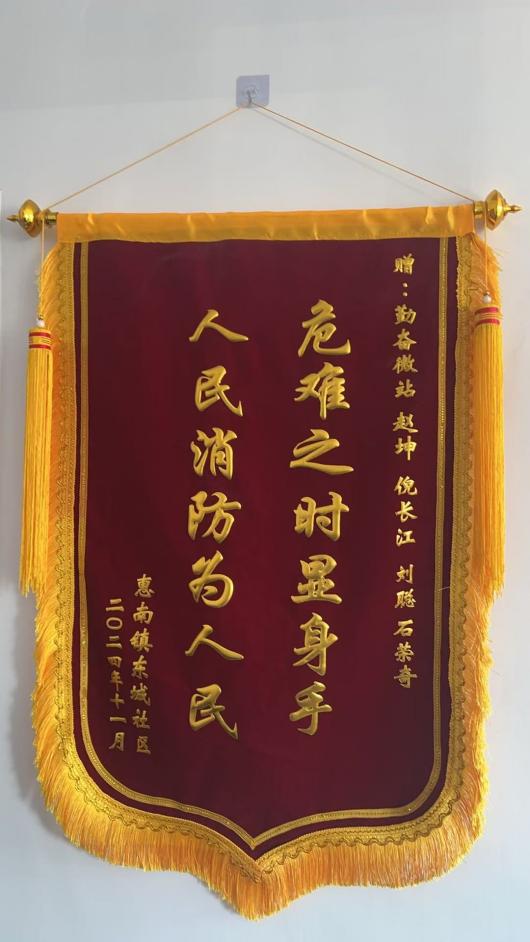 浦东新区惠南镇勤奋微站获赠绣有“危难之时显身手 人民消防为人民”的锦旗