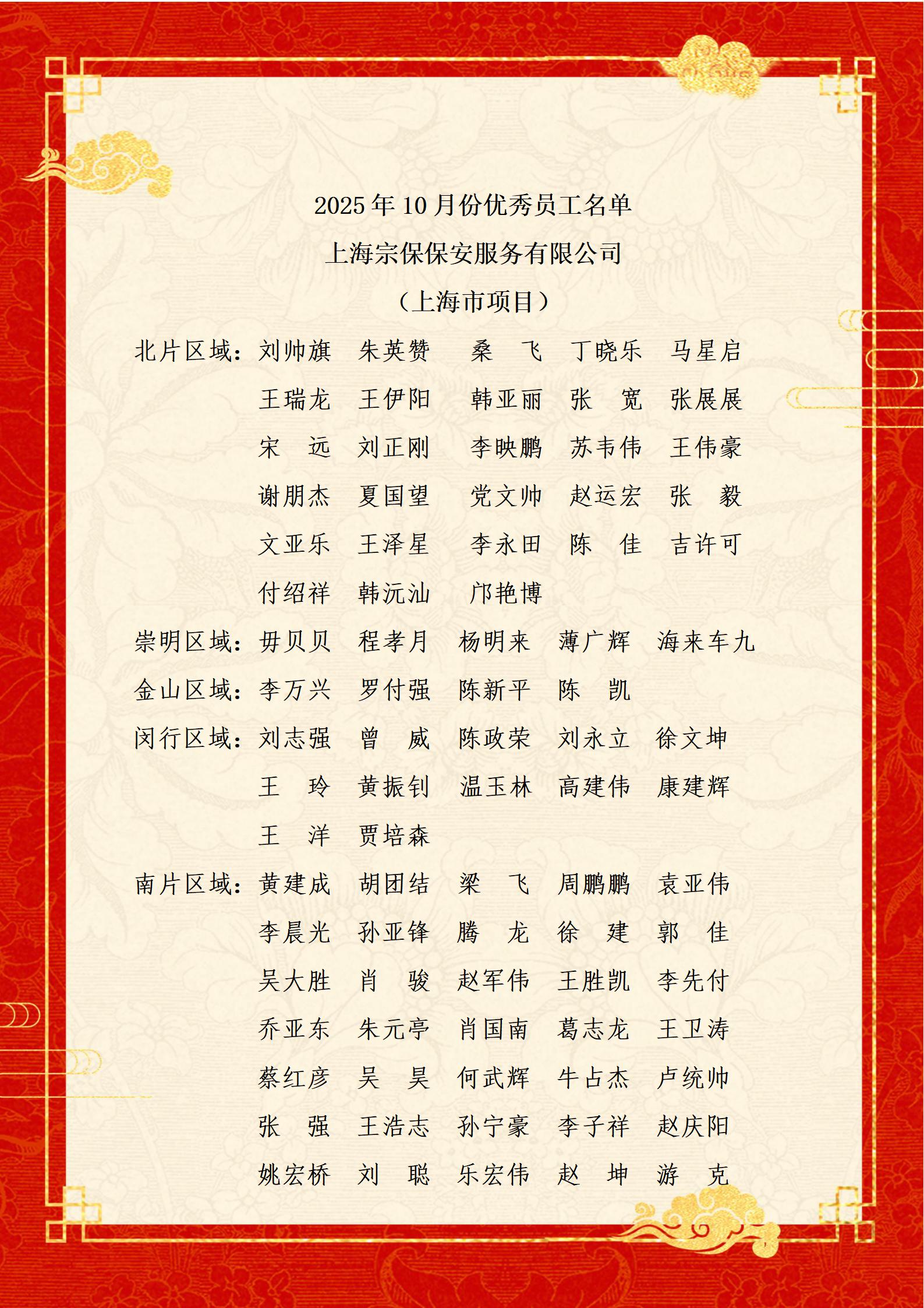 10月份,公司广大员工根据甲方的任务要求,按照公司的部署安排,认真践行公司“规范经营 诚信为本 服务至上”的发展理念,助力完成了多项大型活动安保任务,全力配合甲方做好了城市管理辅助、治安巡逻联防、物业服务保障、生态环境保护、高铁线路巡防等工作。期间,涌现出了一批尽心履责、岗位建功、拾金不昧、热心助人的优秀员工和先进典型。
