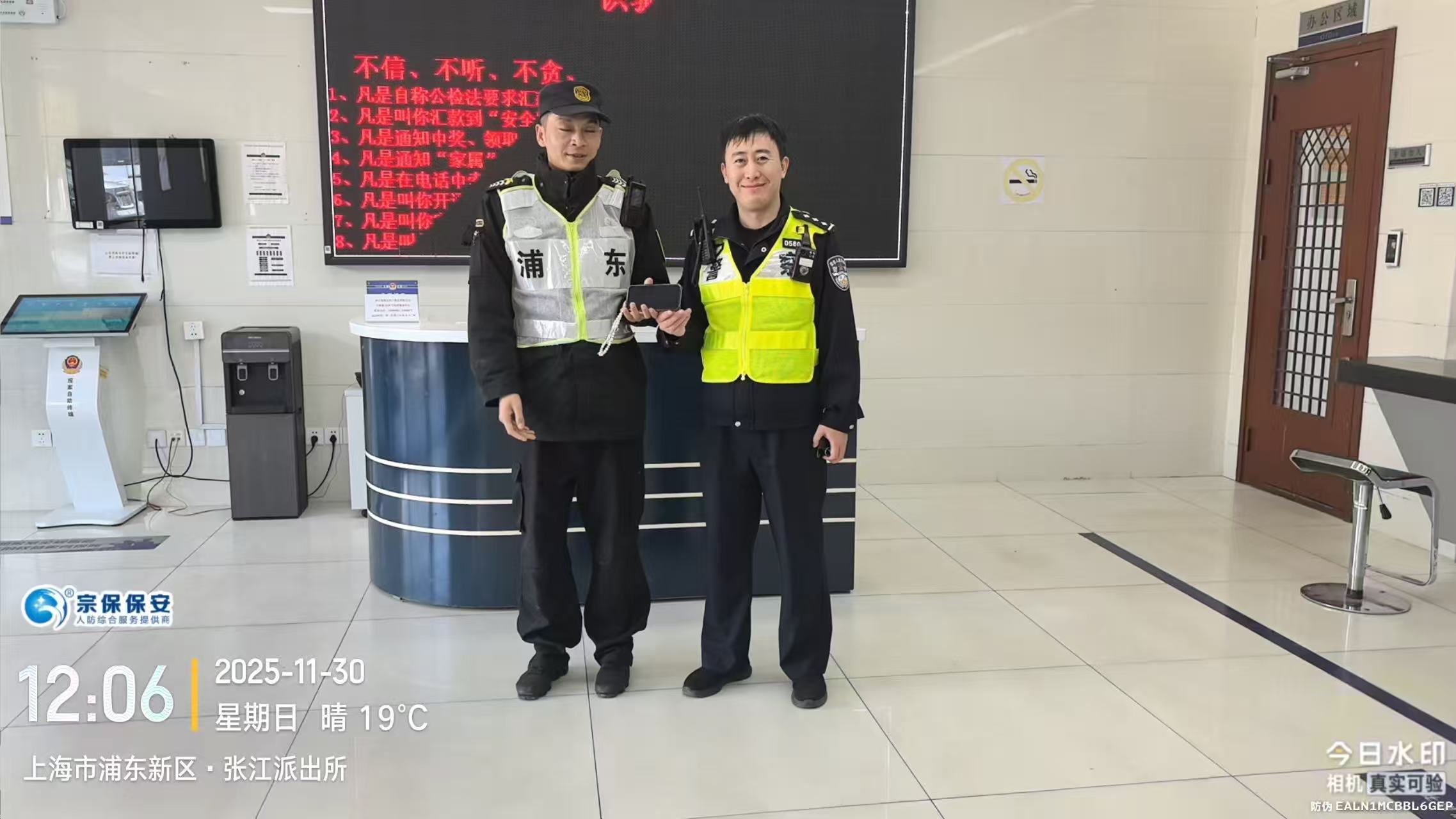 12月7日15:12,宗保公司驻浦东新区三林镇政府项目员工雷帅旗在杨思路附近巡查时,捡到一部Oppo R11手机。考虑到失主可能会返回寻找,雷帅旗就在原地等待。