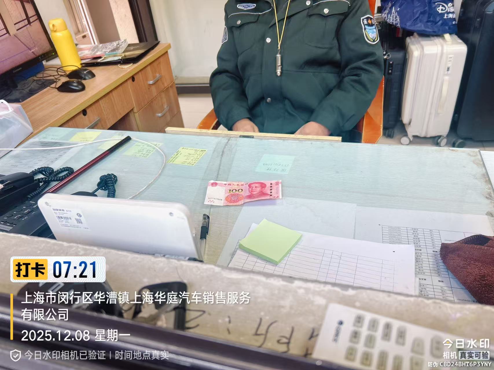 12月8日7:19,宗保公司驻闵行区华漕护校项目员工魏硕阳在执勤期间捡到100元现金。询问周边家长和学生无人认领后,魏硕阳向项目负责人汇报,并按照指示将现金交到学校门卫室。