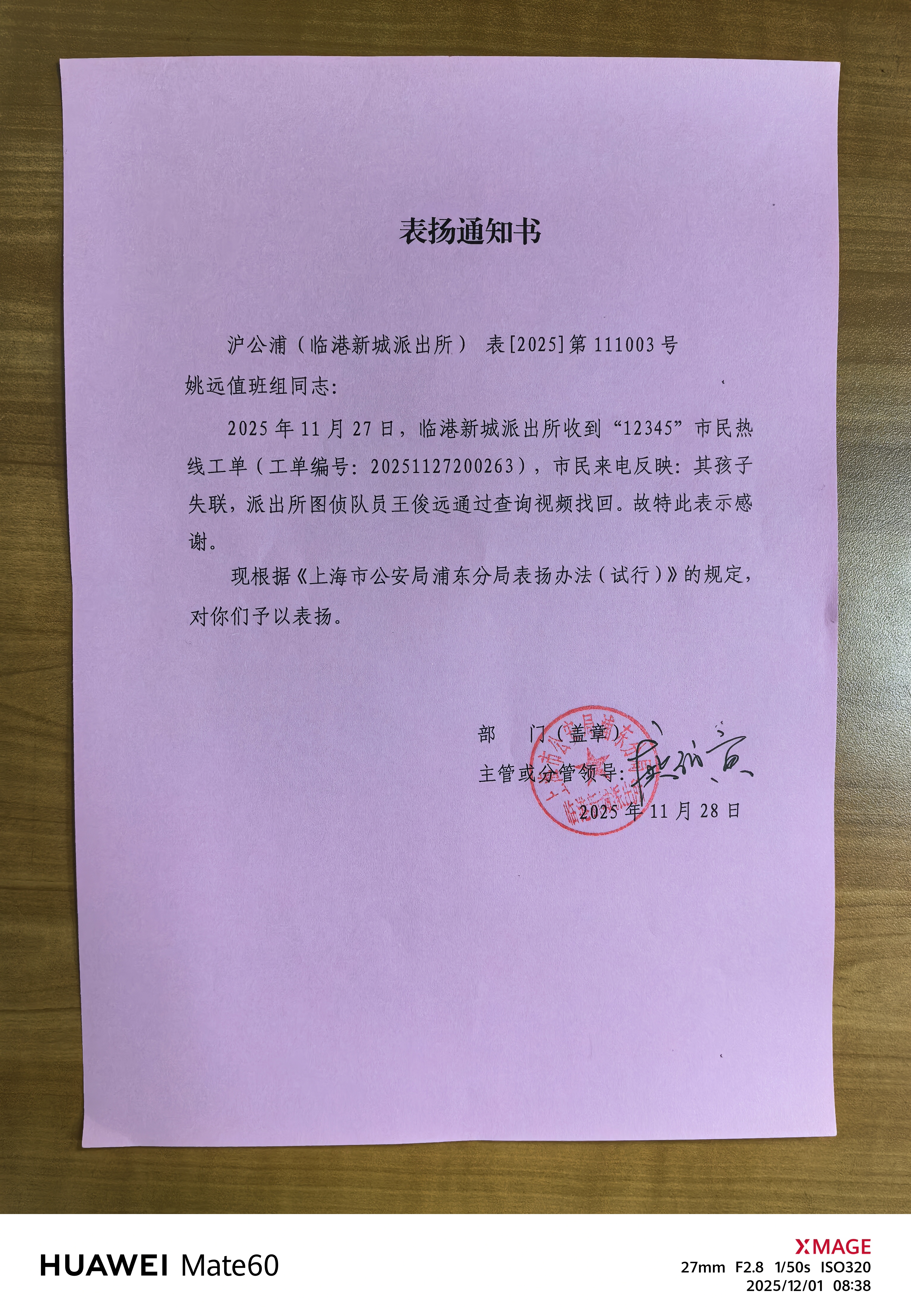 11月26日,宗保公司驻浦东新区临港新城派出所辅助项目员工王俊远协助民警帮助报警人乔女士找到失联儿子,受到乔女士致电上海政务服务便民热线12345点名赞扬。
