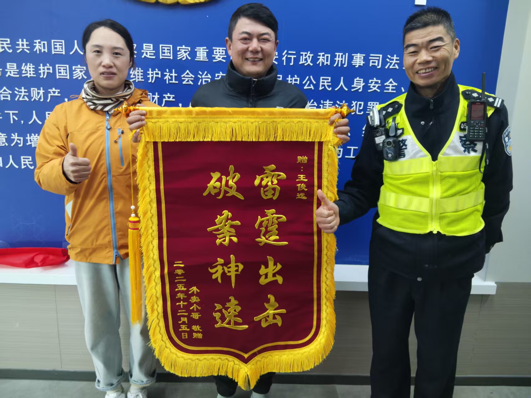12月4日,宗保公司驻浦东新区临港新城派出所辅助项目员工王俊远在协助民警处置一起警情时,凭借高度的工作责任心与细致耐心的工作态度,成功帮助市民宋女士追回被盗外卖,赢得市民真挚赞誉。事后,宋女士专程送来一面绣有“雷霆出击 破案神速”的锦旗,表达对王俊远及派出所高效为民工作的充分肯定与衷心感谢。