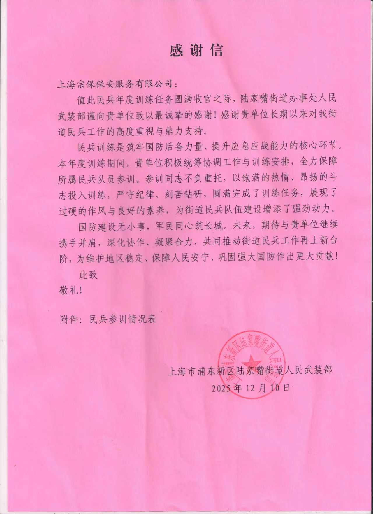 12月10日,宗保公司收到浦东新区陆家嘴街道人民武装部的感谢信,信中对公司鼎力支持陆家嘴街道民兵工作表示衷心的感谢,表扬了参训民兵员工不负重托、严守纪律圆满完成民兵训练任务的出色表现。