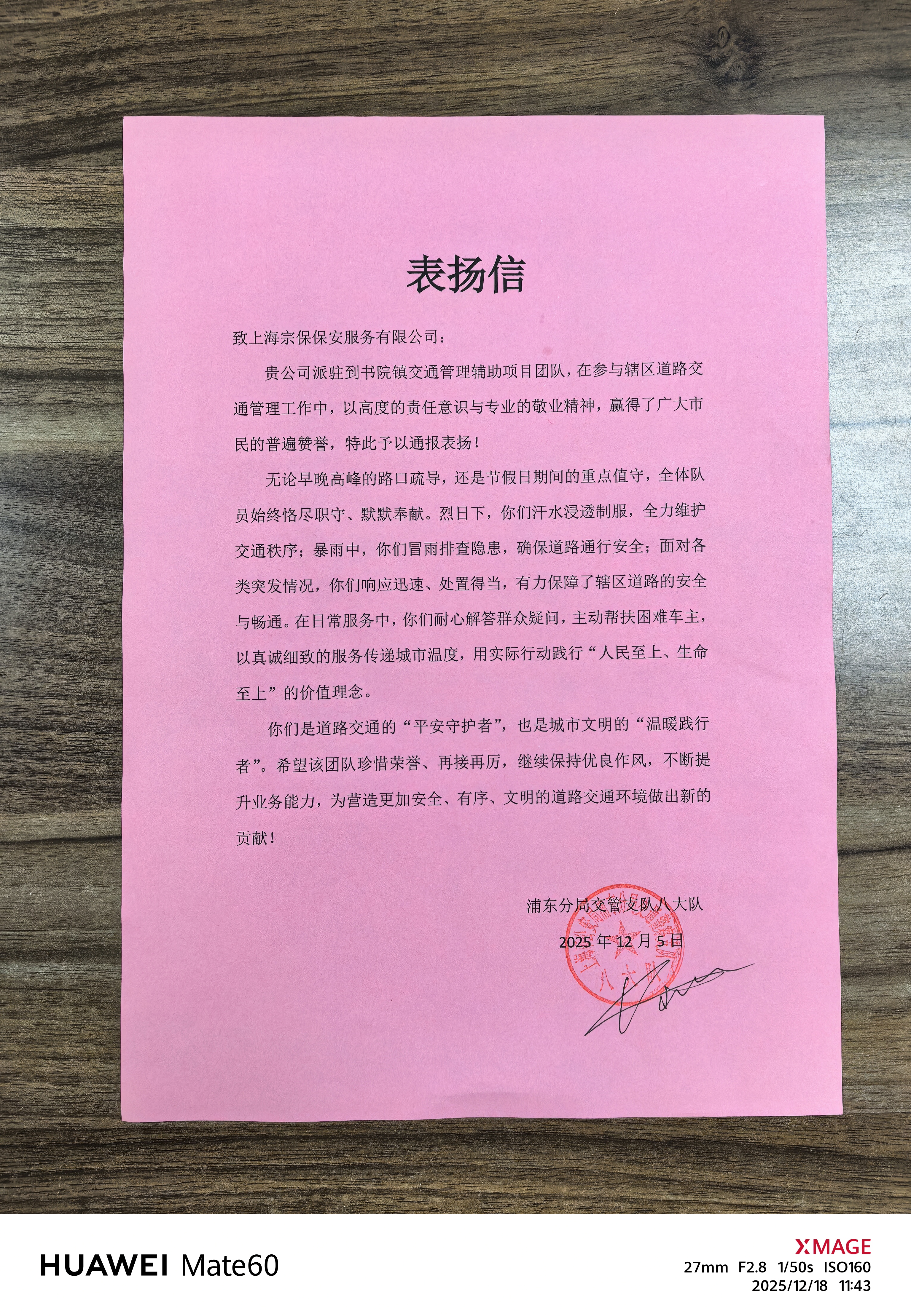 12月5日,宗保公司收到浦东新区公安分局交管支队八大队的表扬信,信中充分肯定了公司驻书院镇交通管理辅助项目员工的工作,表扬了员工坚守岗位、恪尽职守,引导车流人流、处置突发状况,全力维护道路通行秩序,有力保障辖区道路安全、有序畅通的出色表现。 (供稿人:鲁学圆)