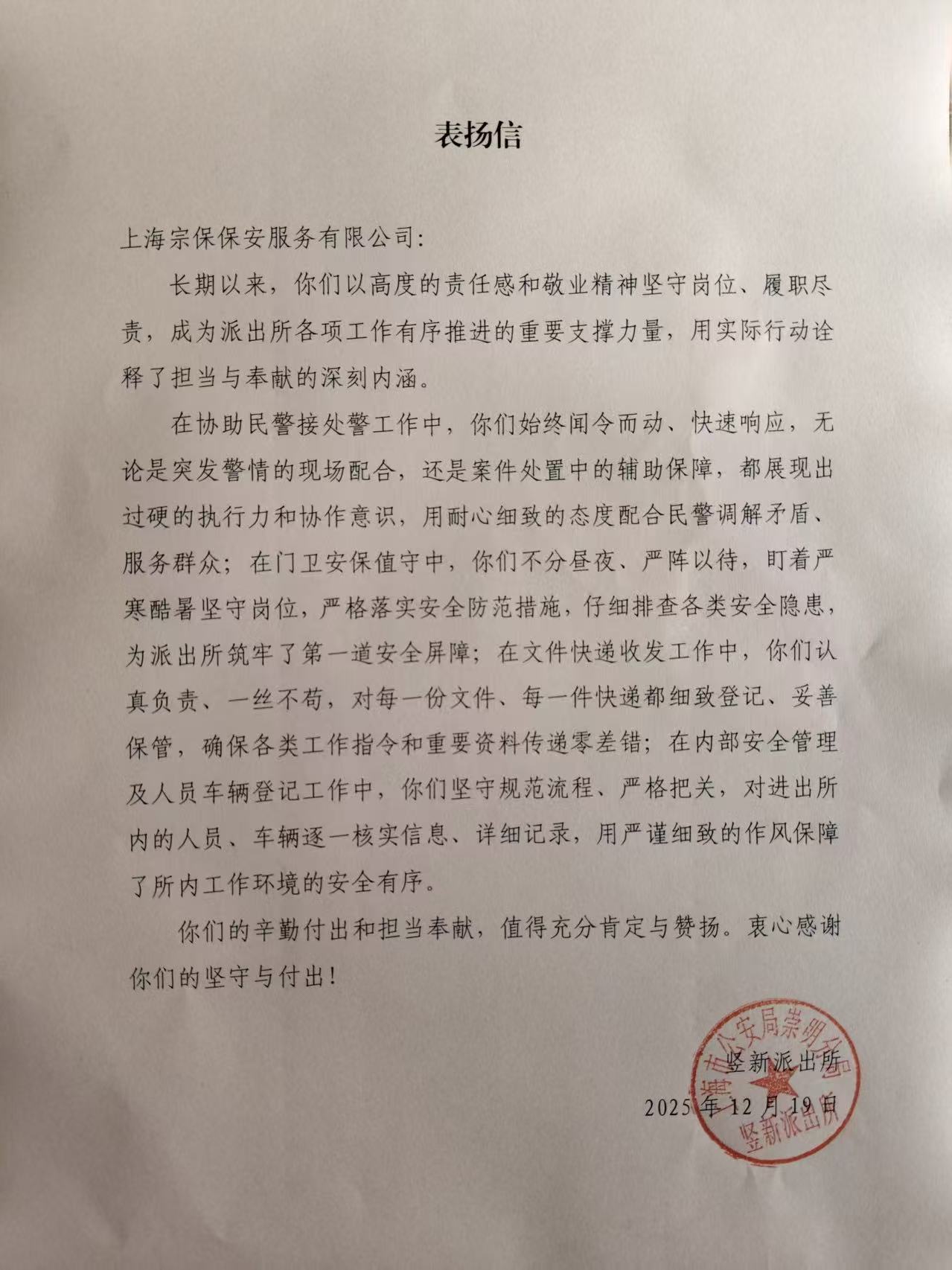 12月19日,公司收到崇明区公安分局竖新派出所的表扬信,信中充分肯定了公司项目员工过去一年在助接处警、门卫安保、文件收发及内部安全管理等工作中的优秀表现,表扬了项目员工们坚守岗位、履职尽责的工作责任感和敬业精神。