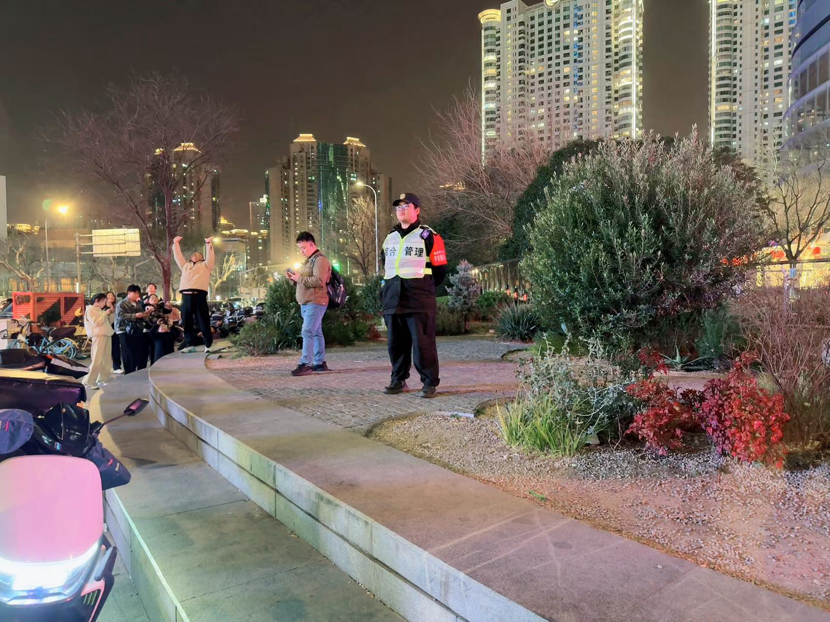 在外滩核心区域,员工们配合公安部门落实大客流监测管控,协助设置安全隔离设施,引导游客有序观景、安全通行,确保滨水区域秩序井然。