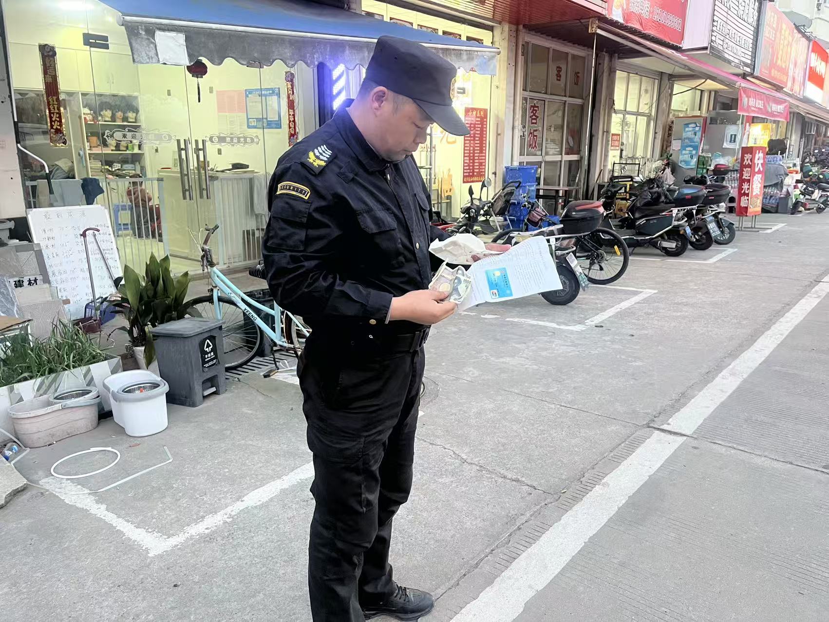 3月10日17:00,宗保公司驻金山区廊下市容项目员工赵属军巡逻至新村路景展家园门口时,捡到一张银行卡及2666日元现钞。由于现场未发现任何失主信息,赵属军第一时间选择原地等待,希望失主能够返回寻找。