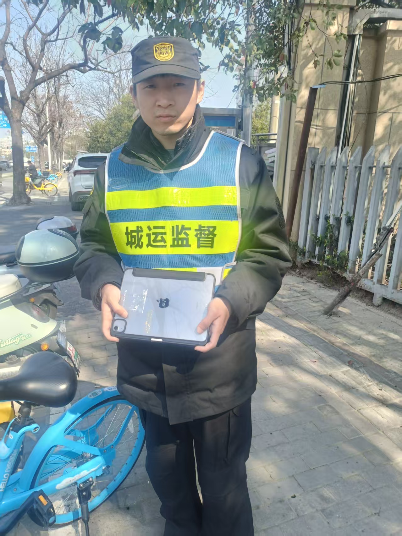 3月14日9:20,宗保公司驻浦东南码头路街道城运辅助项目员工刘帅旗,在东方路3447号附近整理共享单车时,在一辆共享单车车筐内发现一台苹果iPad平板电脑。考虑到失主遗失贵重物品后可能会返回寻找,刘帅旗便决定在原地边执勤边等待。
