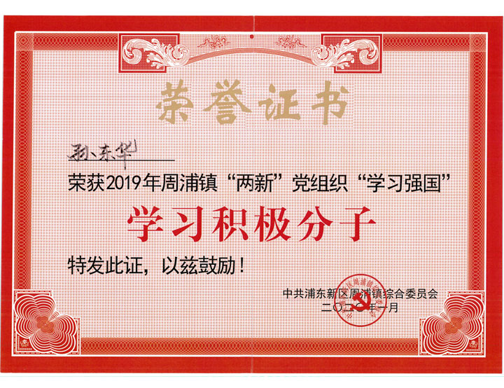 2020年1月3日,浙江民泰公司副总经理孙东华被浦东新区周浦镇评为2019年“两新”党组织“学习强国”学习积极分子,受到表彰。