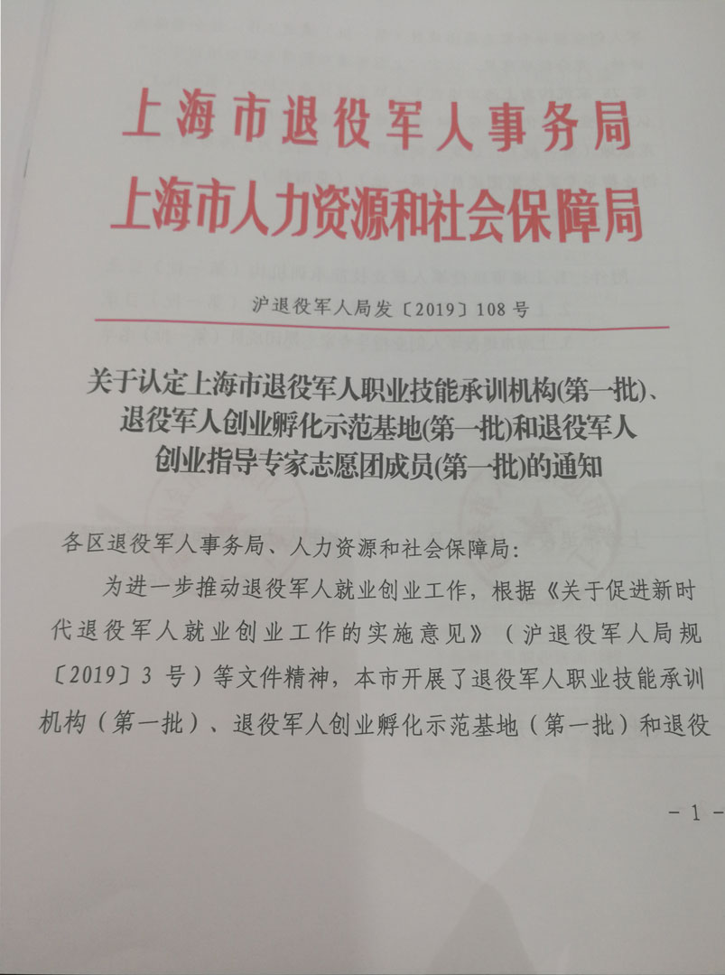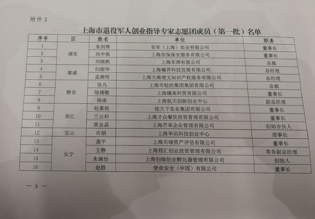 会上,市人力资源和社会保障局就业处副处长黄河宣读了《关于认定上海市退役军人职业技能承训机构(第一批)、退役军人创业孵化示范基地(第一批)和退役军人创业指导专家志愿团成员(第一批)的通知》。宗保公司董事长冯中保被认定为上海市退役军人创业指导专家志愿团成员。