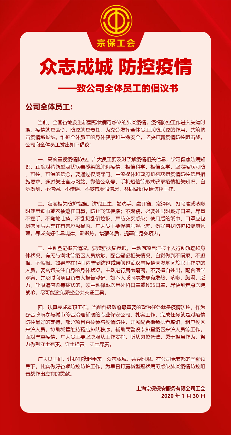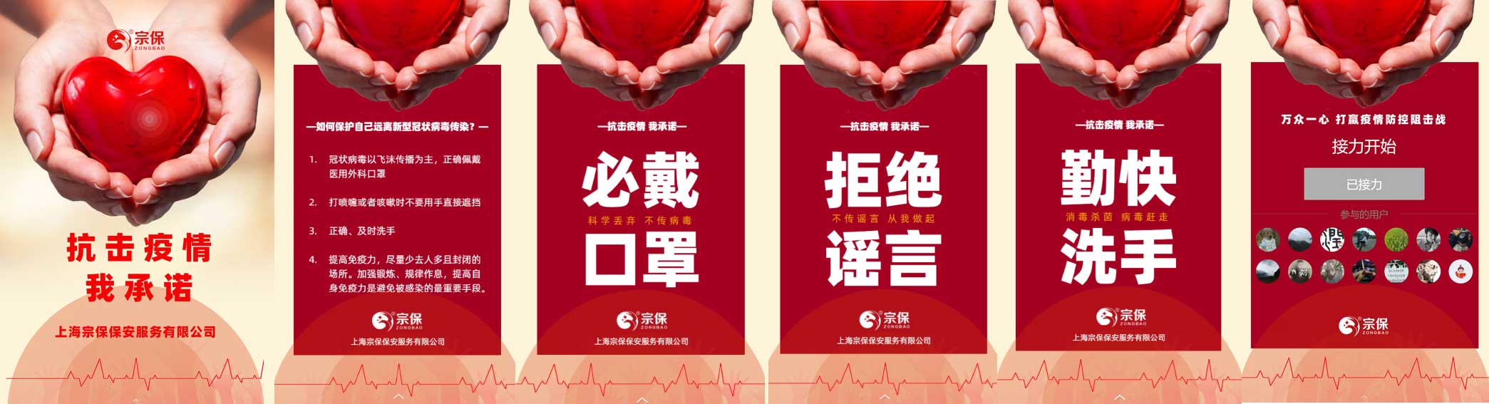 面对新型冠状病毒感染的肺炎疫情形势,宗保公司在各级党委和政府的坚强领导下,在疫情权威部门的科学指导下,有信心有决心做好员工自身防护,积极参与疫情防控阻击战,让客户满意放心,确保各项任务圆满完成。