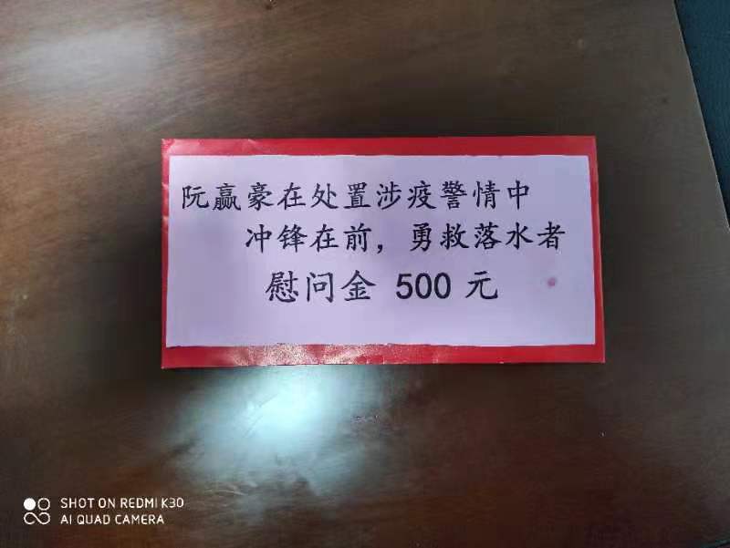 当天晚上,派出所领导对阮赢豪的行为提出表扬,并发放了慰问金。