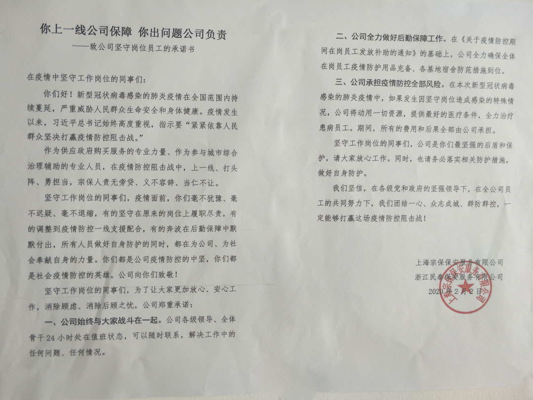 公司领导带头,勠力同心一起战“疫”。公司党支部一班人始终有一个共识:宗保公司的责任担当不仅体现在对社会负责,对工作负责,更体现在对广大员工身心健康等基本权益保障的负责。疫情发生后,公司领导带头做出抗击疫情承诺,带头参与募资捐款,带头落实防护措施。深入到项目所在点,了解甲方的需求;解决员工实际困难,做好自身安全防护,与员工一起坚守在抗疫第一线。公司建立24小时值班制度,领导做到吃住在公司,调度在公司,疫情不结束,值班不结束。