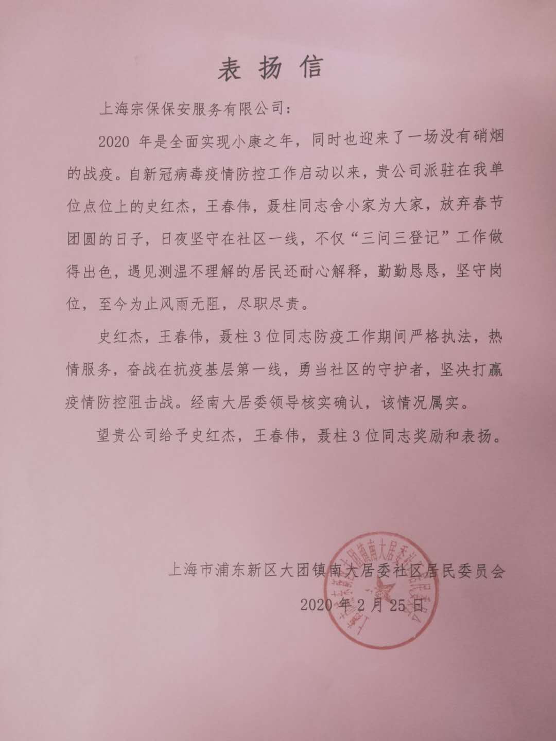 2月25日,宗保公司收到浦东新区大团镇南大居委社区的表扬信,表扬公司驻大团项目的史红杰、王春伟、聂柱三名队员在疫情防控中的工作表现。