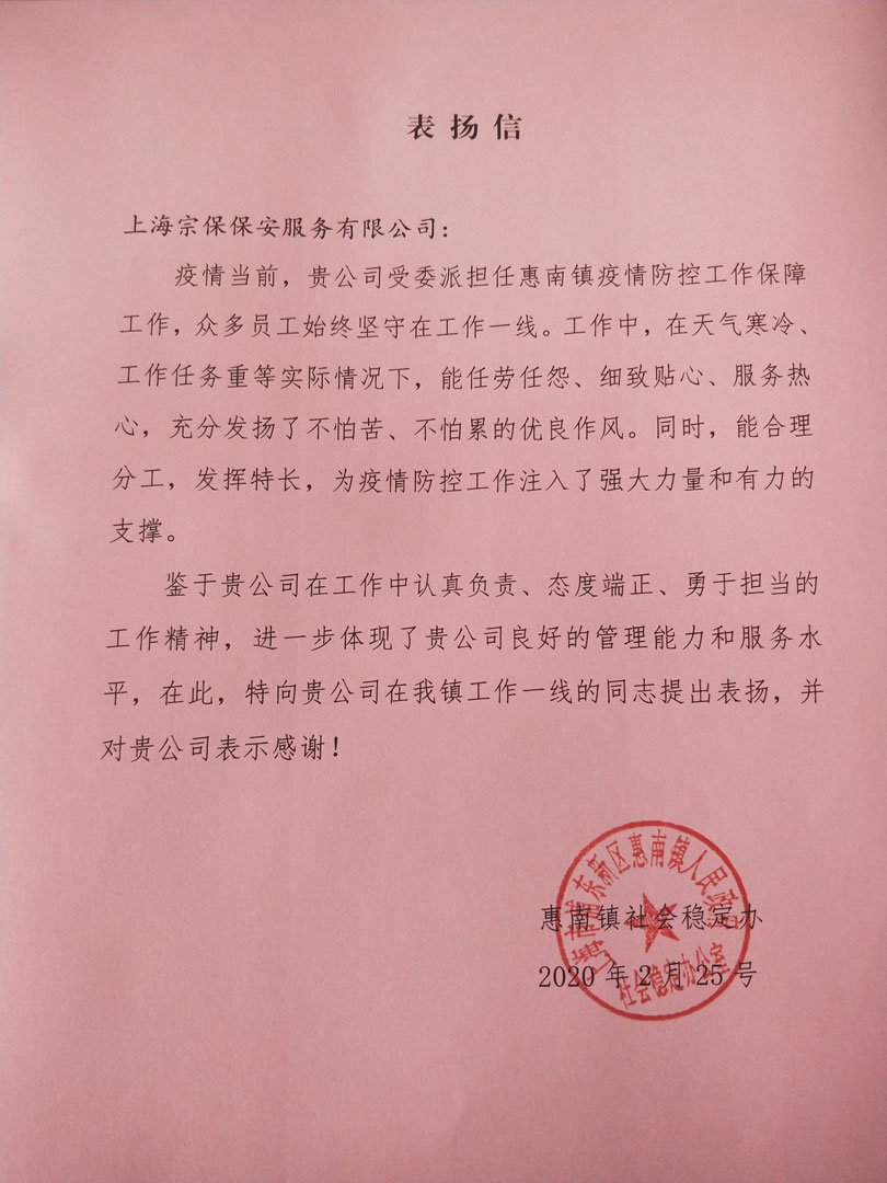 2月25日,浦东新区惠南镇稳定办送来表扬信,表扬宗保公司驻惠南市容项目全体队员在疫情防控中认真负责、态度端正、勇于承担的工作精神。