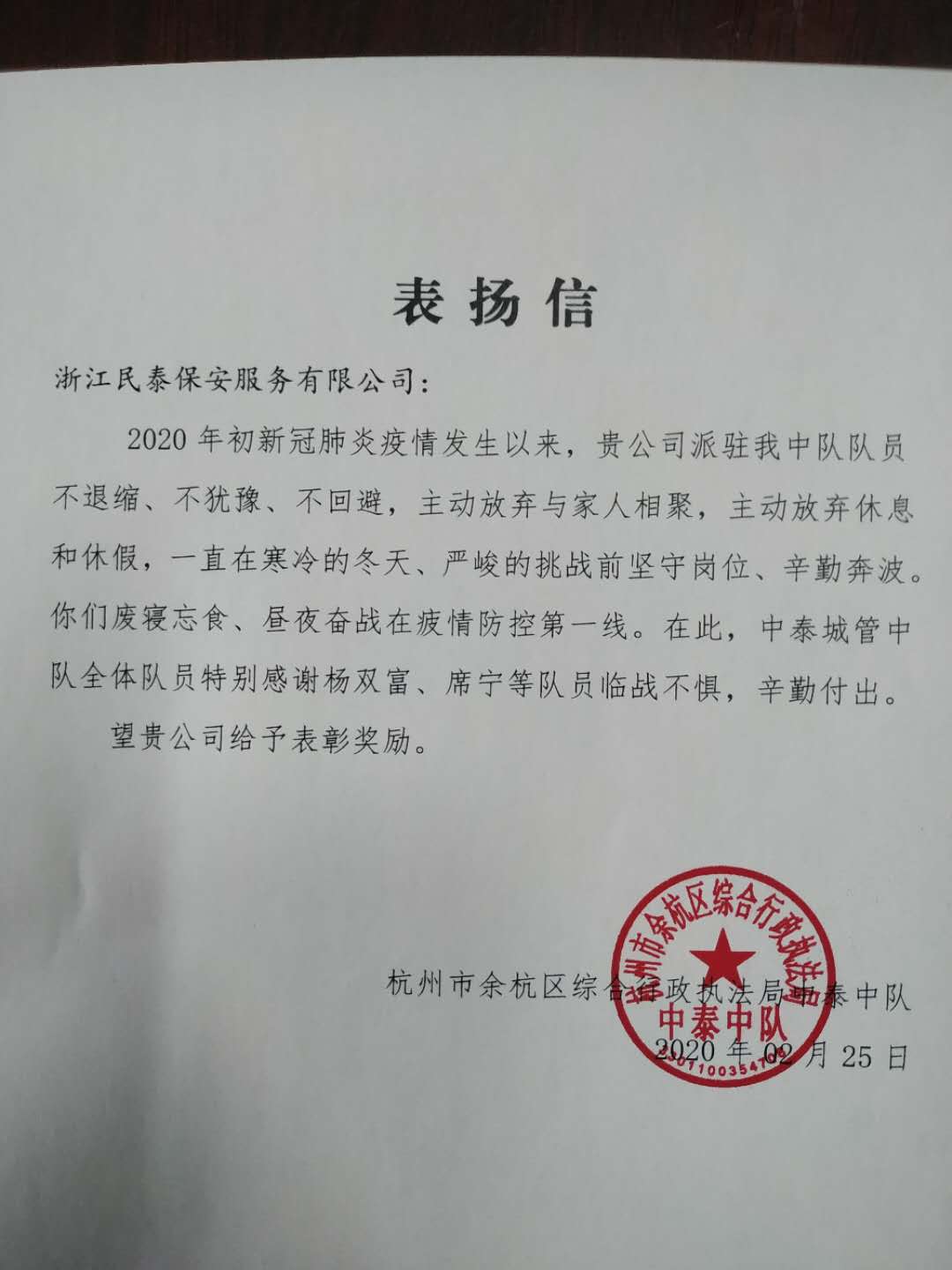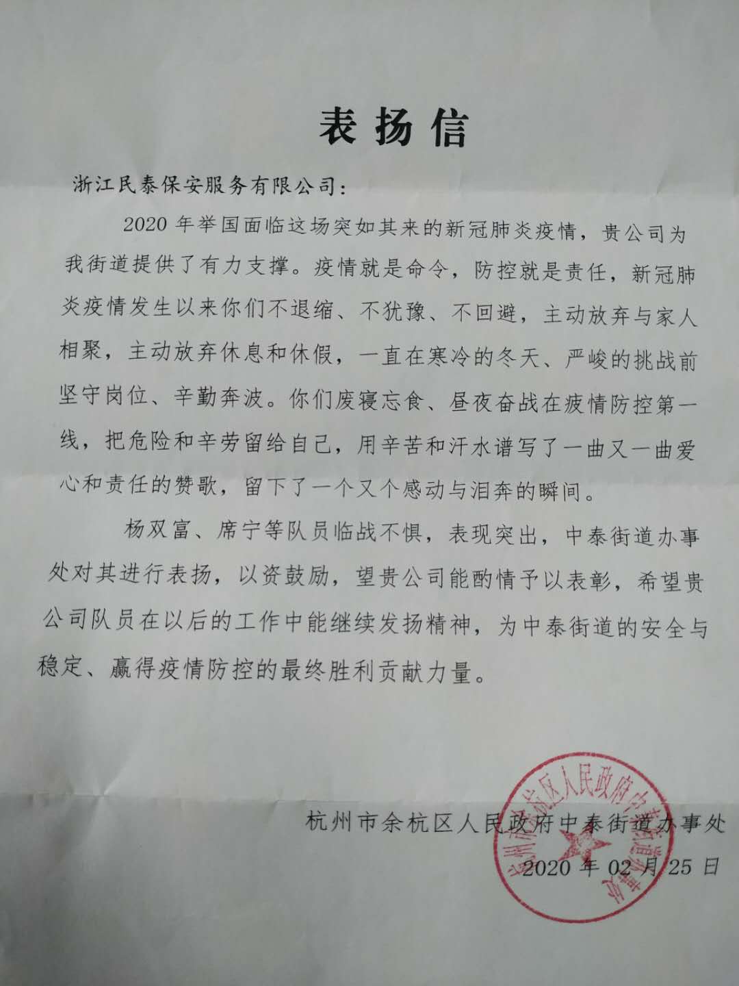 2月25日,杭州市余杭区中泰街道办事处和该街道城管队分别送来表扬信,表扬浙江民泰公司驻该街道城管项目全体队员在疫情防控中的工作表现,点名表扬杨双富、席宁两名队员。