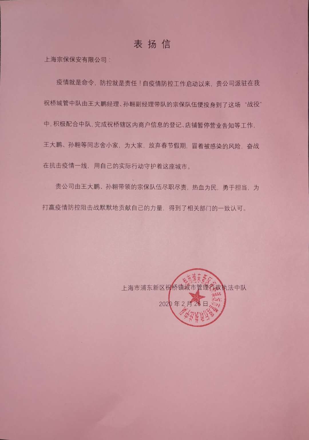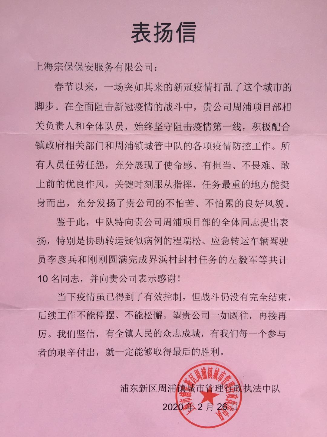 2月26日,浦东新区周浦镇城管中队送来表扬信,表扬公司驻周浦市容项目全体队员在疫情防控中的工作表现,特别对协助转运疑似病例的程瑞松、应急转运车辆驾驶员李彦兵、圆满完成界浜村封村任务的左毅军等10名队员重点表扬。