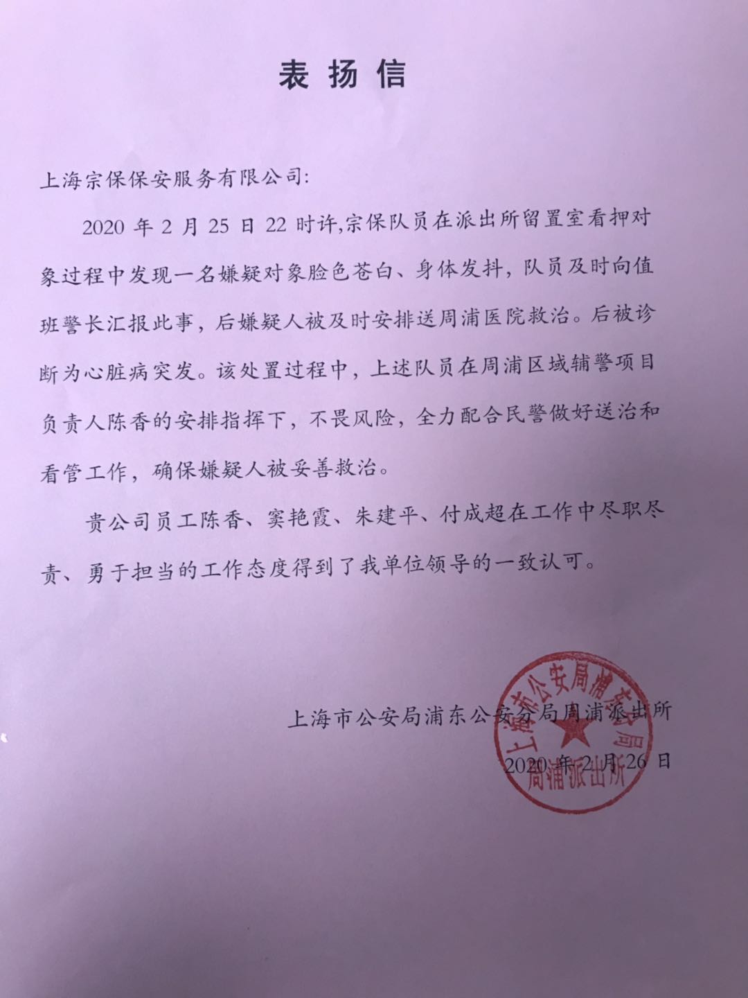 2月26日,浦东公安分局周浦派出所送来表扬信,表扬公司驻该所辅警项目陈香、窦艳霞、朱建平、付成超在工作中及时发现嫌疑对象发病,专业正确应急处置的敬业精神。