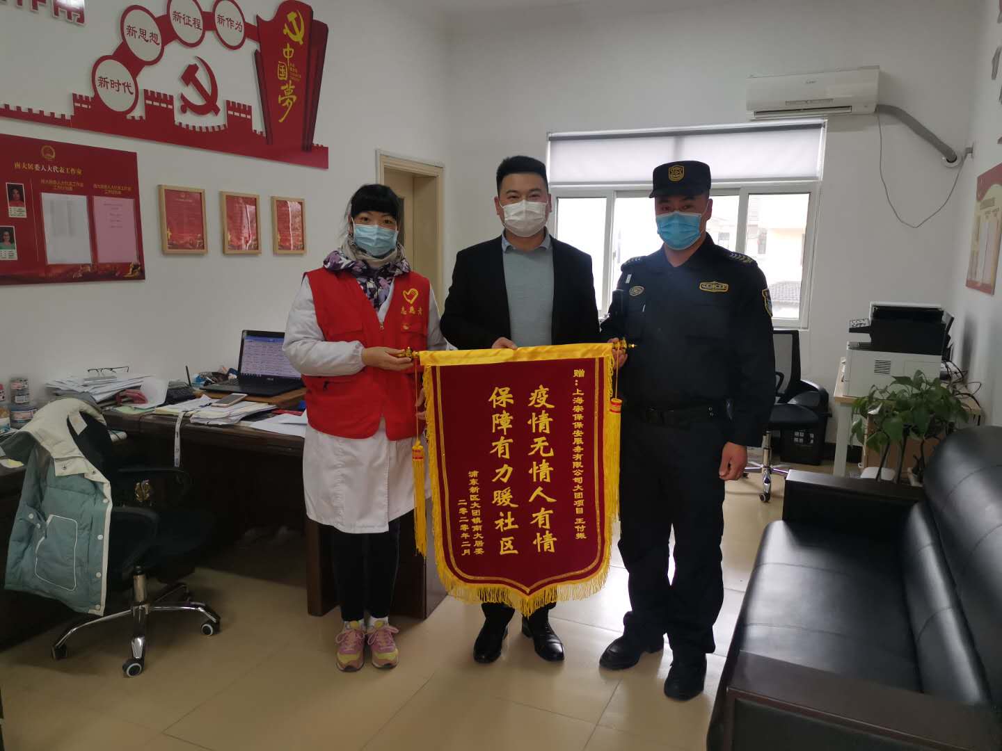 2月28日,浦东新区大团镇南大居委送来一面锦旗,赞扬公司驻大团市容项目在疫情防控中的工作表现,对全体队员表示感谢。