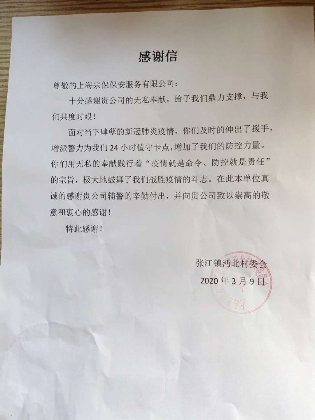 3月8日,张江镇中心居委送来表扬信,表扬公司驻孙桥辅警项目全体队员,感谢宗保公司在这次疫情防控中及时伸出援手,增派辅警力量值守固定岗位,增强防控力量。